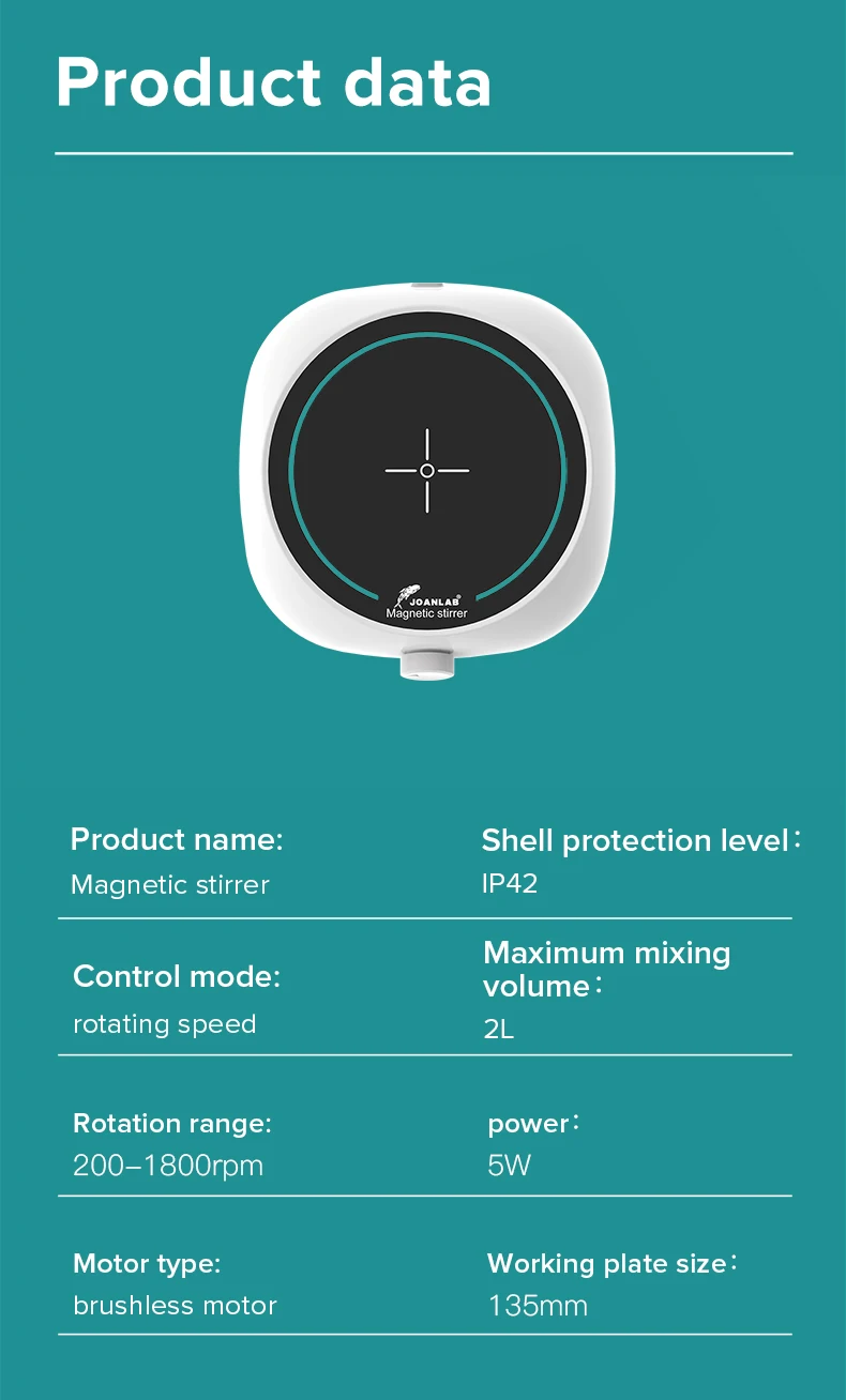 Название продукта: магнитная мешалка мощность: 5 Вт Скорость: 200-1800 об/мин размер рабочей сковороды: 135 мм уровень защиты корпуса: IP42 напряжение: 100-240 В 50/60 Гц размер изделия: 168*160*47 мм диапазон размеров Magneton: 20-30 мм