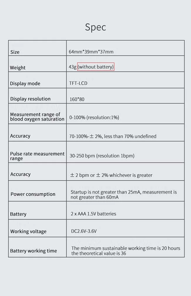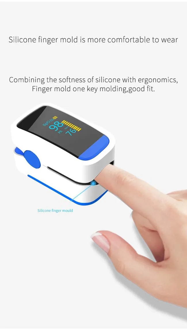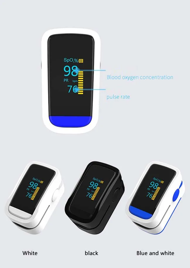 Пульсоксиметр может использоваться для измерения насыщенности человеческого гемоглобина и частоты пульса через палец, а также для обозначения интенсивности пульса через дисплей бара. Подходит для использования в семье, офисе. Особенности: 1. Работа продукта проста и удобна. 2. Продукт небольшой по объему, светильник по весу и удобен в транспортировке. 3. Потребление энергии продукта низкое, и батарейки aaa могут работать непрерывно в течение 20 часов. 4. Пульсоксиметр имеет небольшой объем, низкое энергопотребление, удобную работу и портативность. 5. Подходит для использования в семье, офисе, кислородном баре или любой другой публике. Упаковочный лист: 1 * оксиметр
