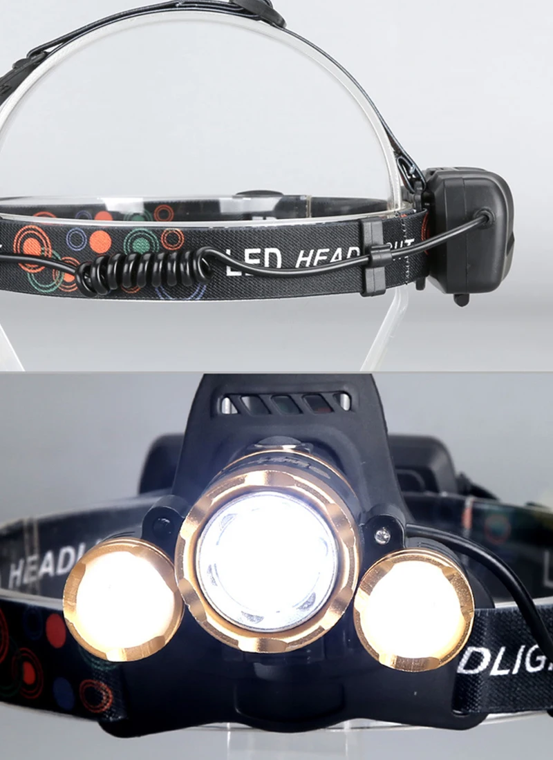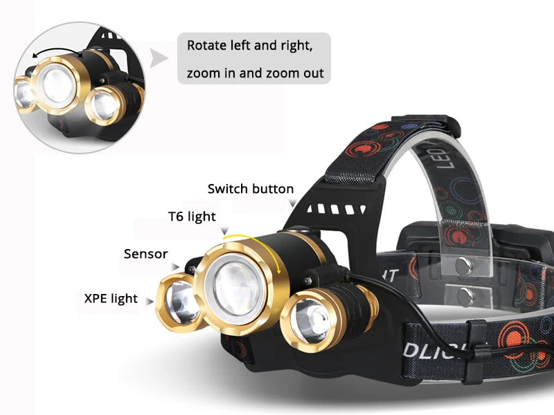 Производит ультра яркий луч света на 3 светодиодах.Многократное использование для фары или фонарь, как этот товар.3 режима индикации, такие как 1 x T6 высокий светильник/2 * XPE высокий светильник/1x T6 + / 2 * XPE стробоскоп.Обширная продолжительность жизни светодиодный (10000 часов).Аккумуляторная батарея и универсальное зарядное устройство.Регулируемая повязка на голову, удобно носить.Технические характеристики: