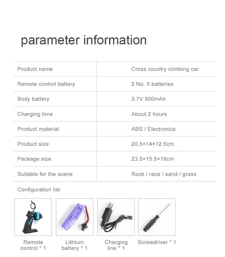 Car body battery: 3.7V 500 ma lithium iron phosphate battery for car body, 2 AA batteries for remote control (self-purchased) Car body weight: 284G a set weight: 554G