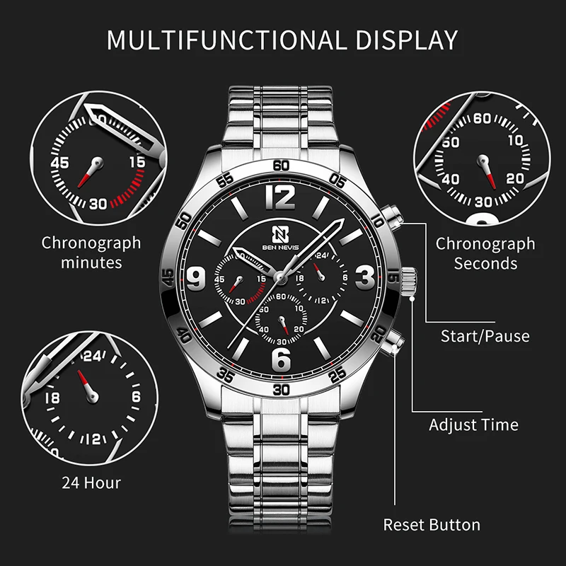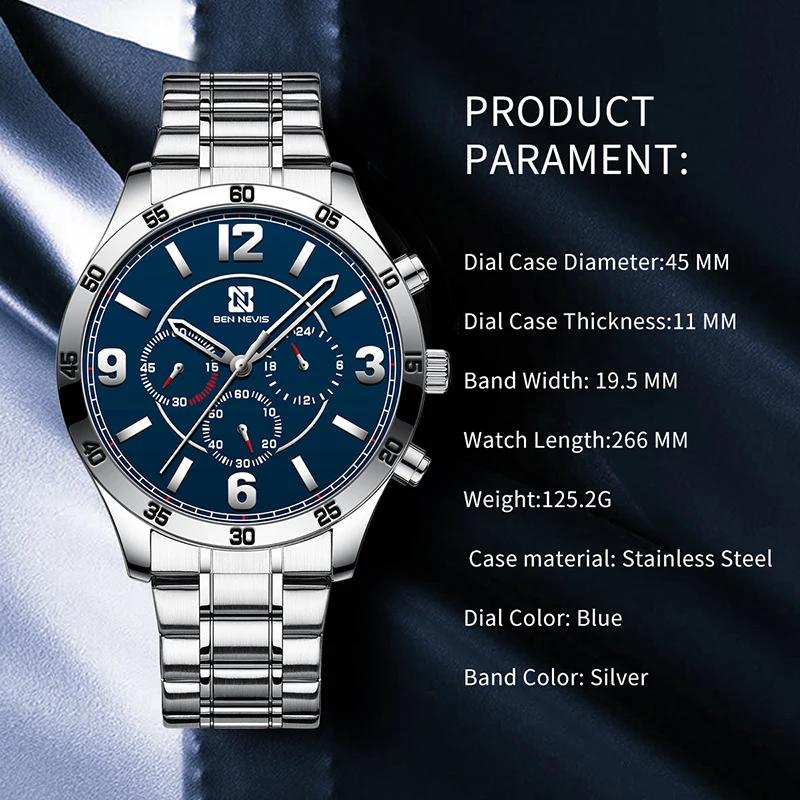 Циферблат чехол Диаметр: 45 мм Циферблат чехол Толщина: 11 мм Группа Ширина: 19,5 мм Длина Часов: 266 мм Вес: 125,2 г Чехол Материал: Нержавеющая сталь Цвет циферблата: черный/синий Группа Цвет: серебро