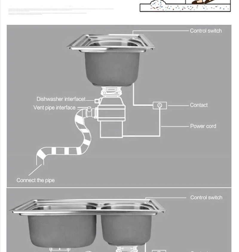 Воздушный выключатель и защита от перегрузки: одно дно решает кухонный мусор. Воздушный переключатель использует пневматический принцип, делает его более легким и безопасным для запуска машины. Защита от перегрузки в нижней части защищает двигатель, когда он перегружен, перегревается и так далее, продлевая срок службы двигателя, поэтому, пожалуйста, держите его touchable при установке.