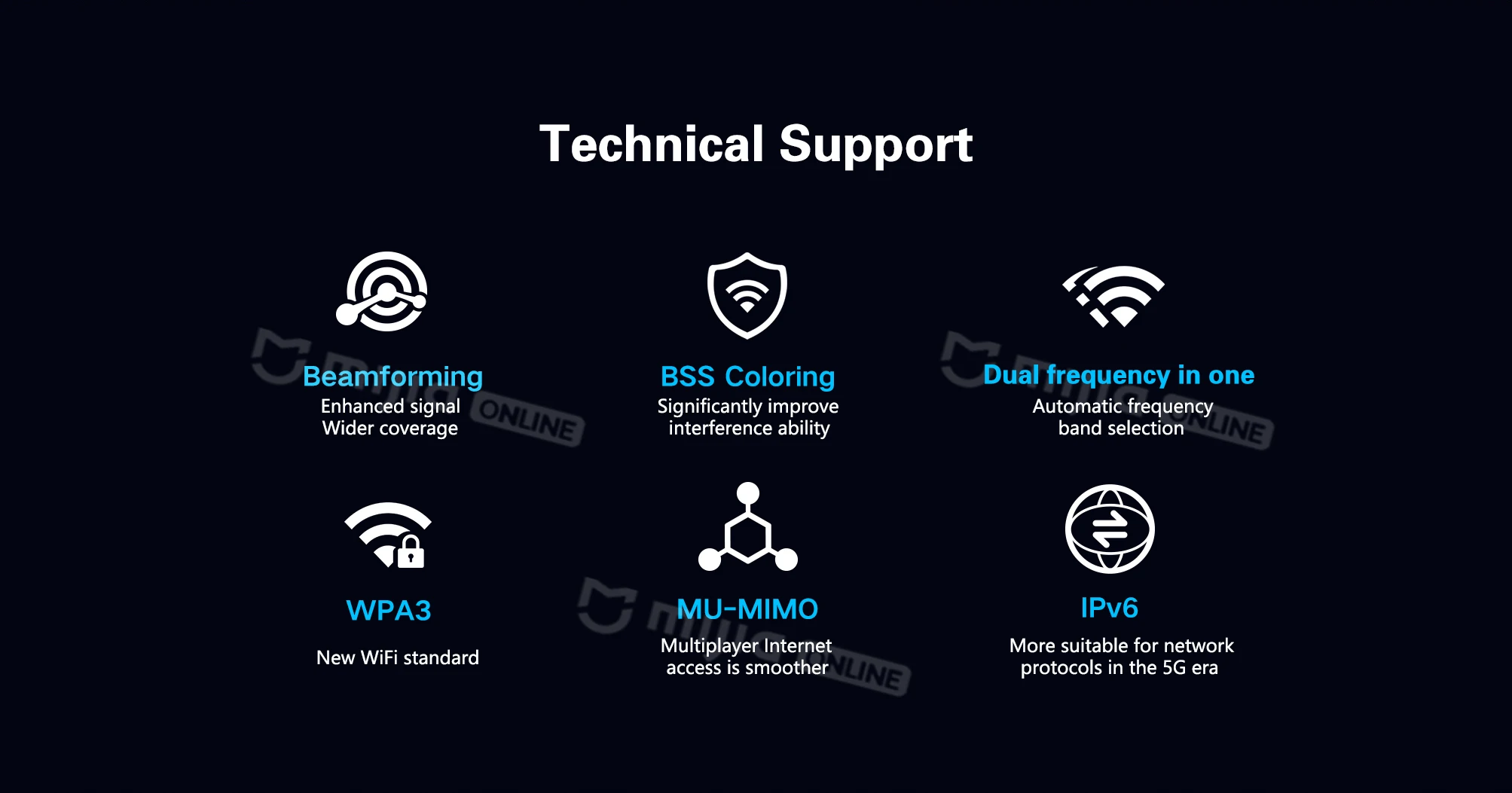 2,4 ГГц и 5 ГГц полосы оснащены двумя Qorvo "высокопроизводительный независимый усилитель сигнала (PA + LNA). По сравнению с интегральными усилителями сигнала сила сигнала увеличивается на 4 дБ, а теоретическое покрытие увеличивается на 50%."PA (усилитель мощности) эффективно повышает мощность передачи сигнала, LNA, (усилитель с низким уровнем шума) Улучшает чувствительность приема сигнала.