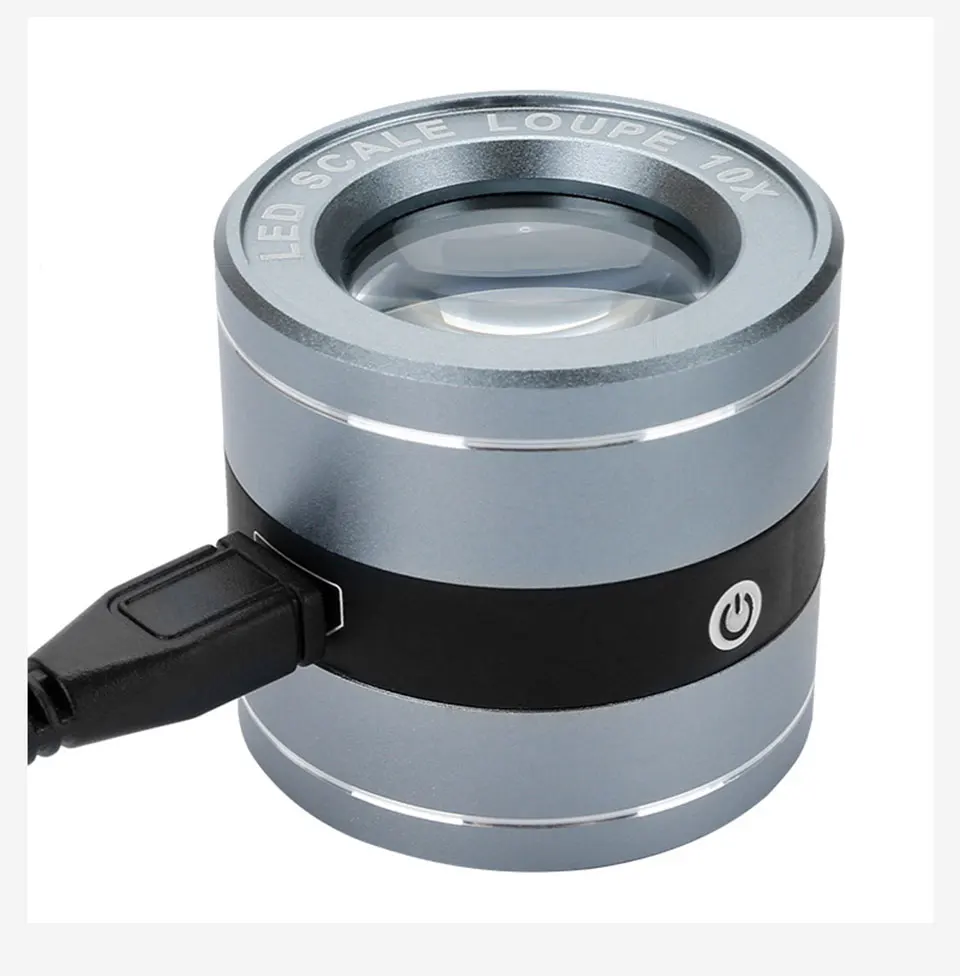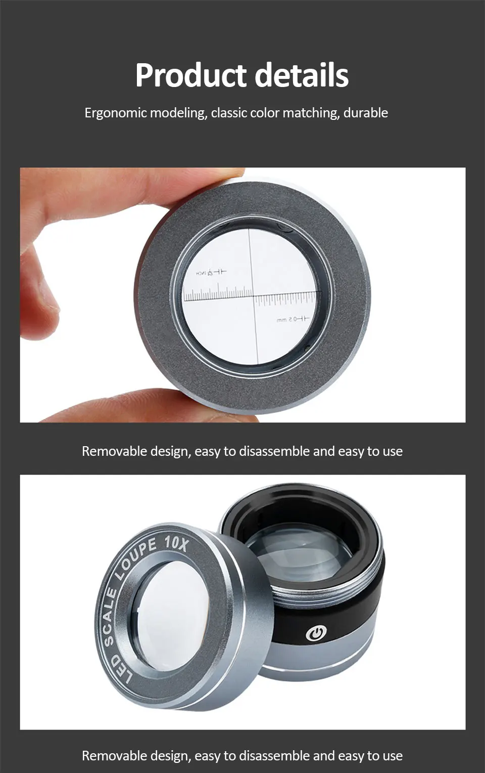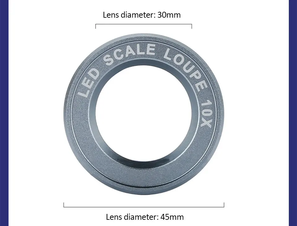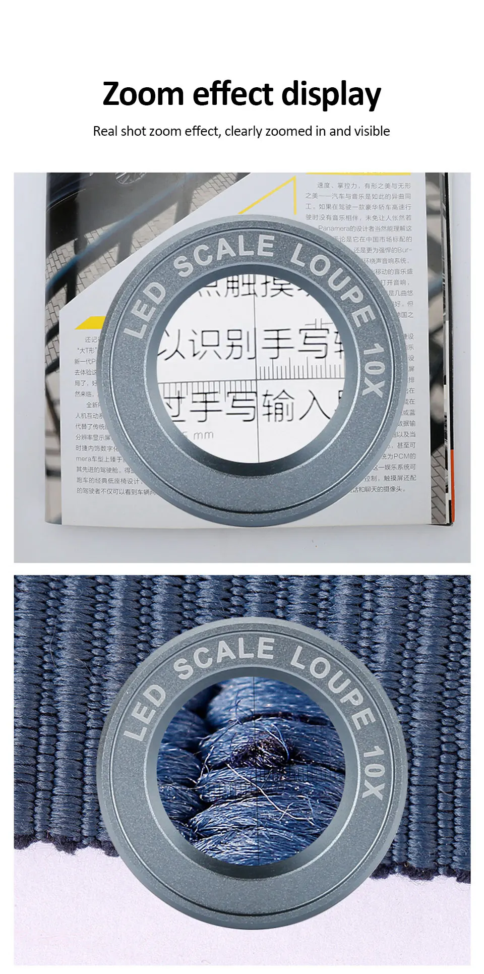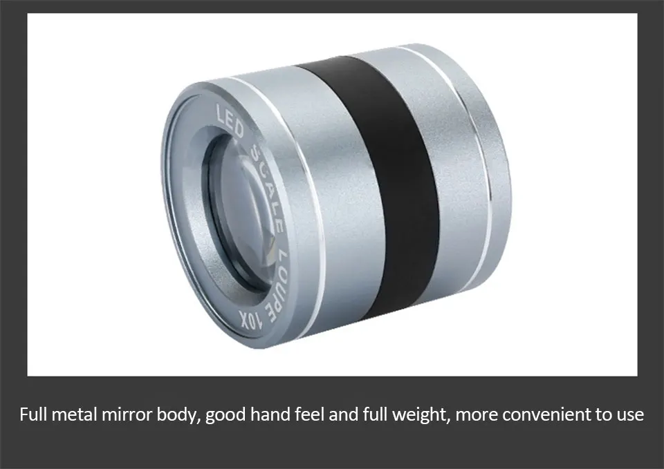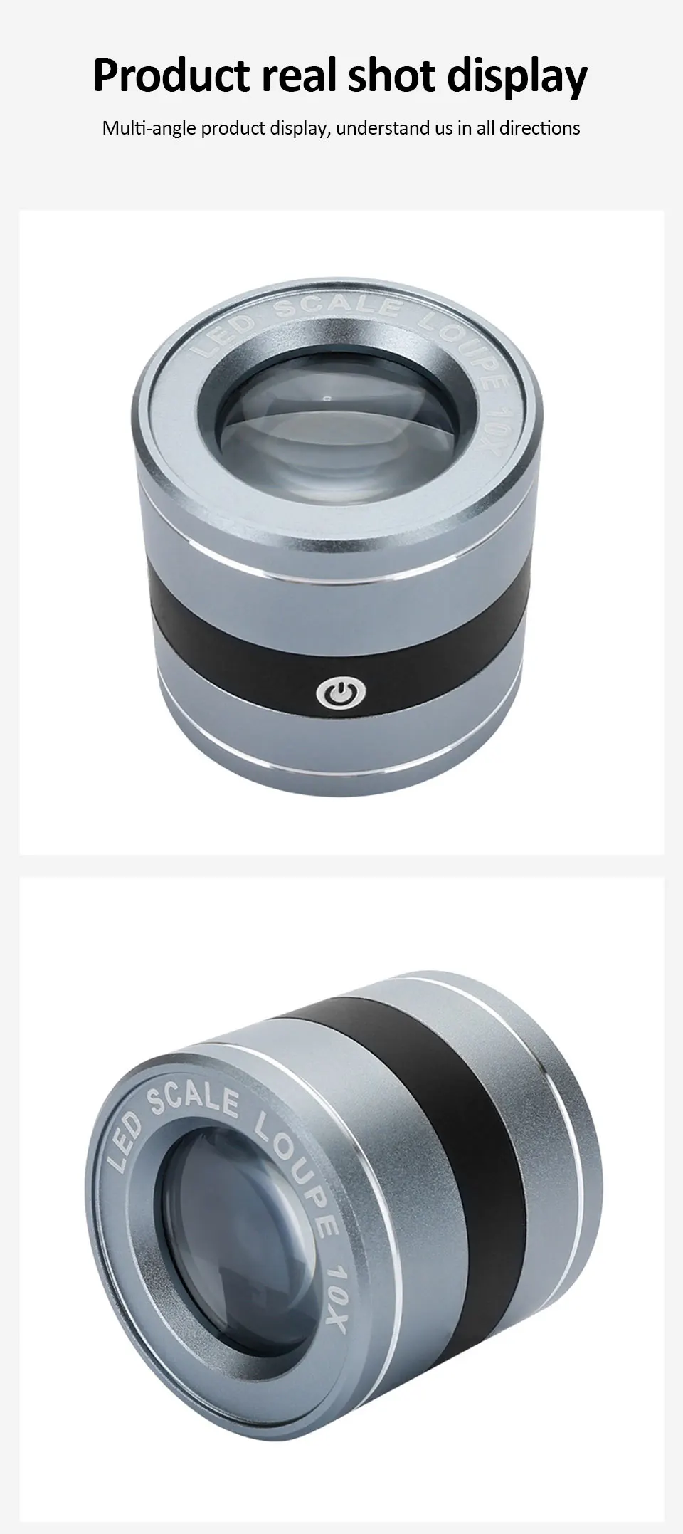 Название: металлическое цилиндрическое увеличительное стекло Материал: алюминиевый сплав + оптическая стеклянная линза + стеклянная пластина Увеличение: 10X Диаметр линзы: 30 мм Источник освещения: 2 * белый светодиодный светильник, 2 * флуоресцентный светодиодный светильник Зарядный терминал: Micro USB/DCV5V 2A Время использования батареи: 2h (белый светильник)/1h (Флуоресцентный светильник) Размер изделия: 43*45 мм Размер упаковки: 70*75*68 мм Вес: 80 г (вес нетто)/155 г (вес посылка) В посылка содержит: 1 * увеличительное Стекло 1 * салфетка для очистки линз 1 * USB кабель 1 * Руководство на китайском/английском языках 1 * тряпичным мешком 1 * коробка