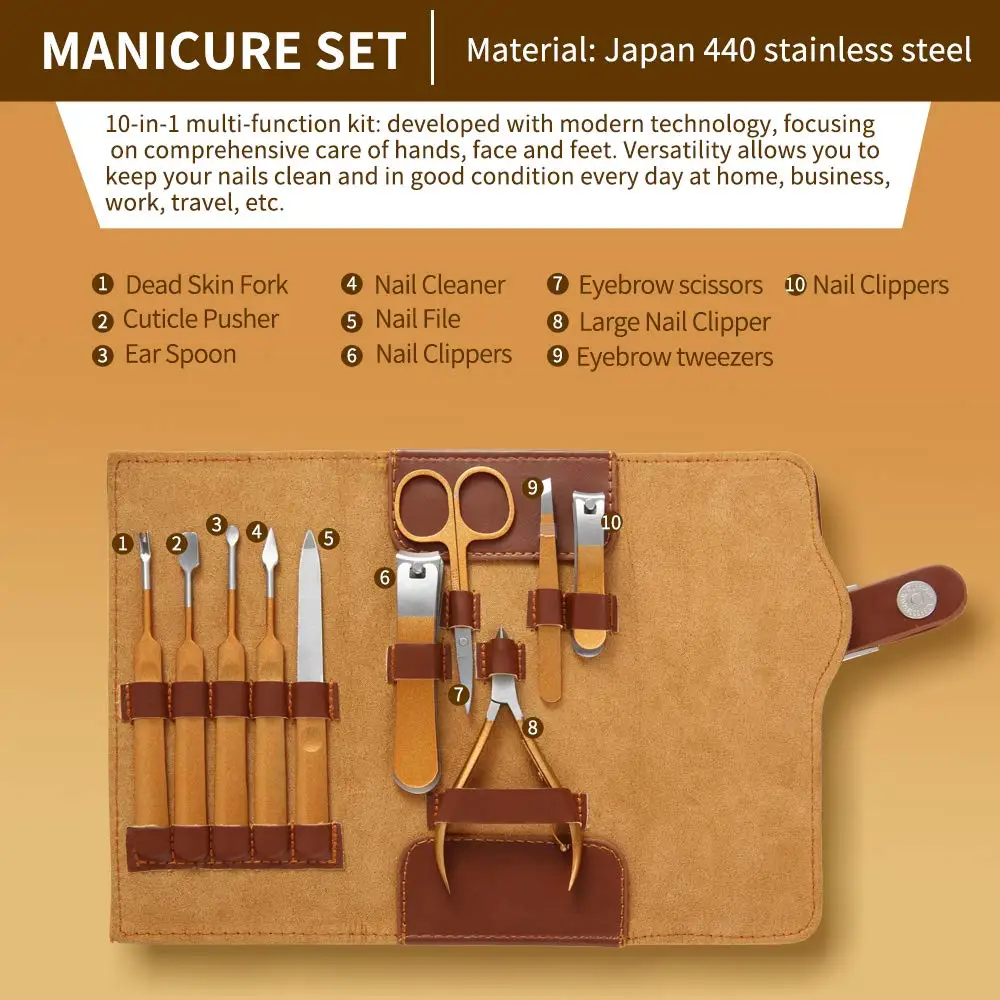10 шт Маникюрный набор люкс/люкс Натуральная Коричневая кожа уход за ногтями Персональный маникюрный и педикюрный набор, маникюрный набор путешествия и уход набор, клипер для ногтей