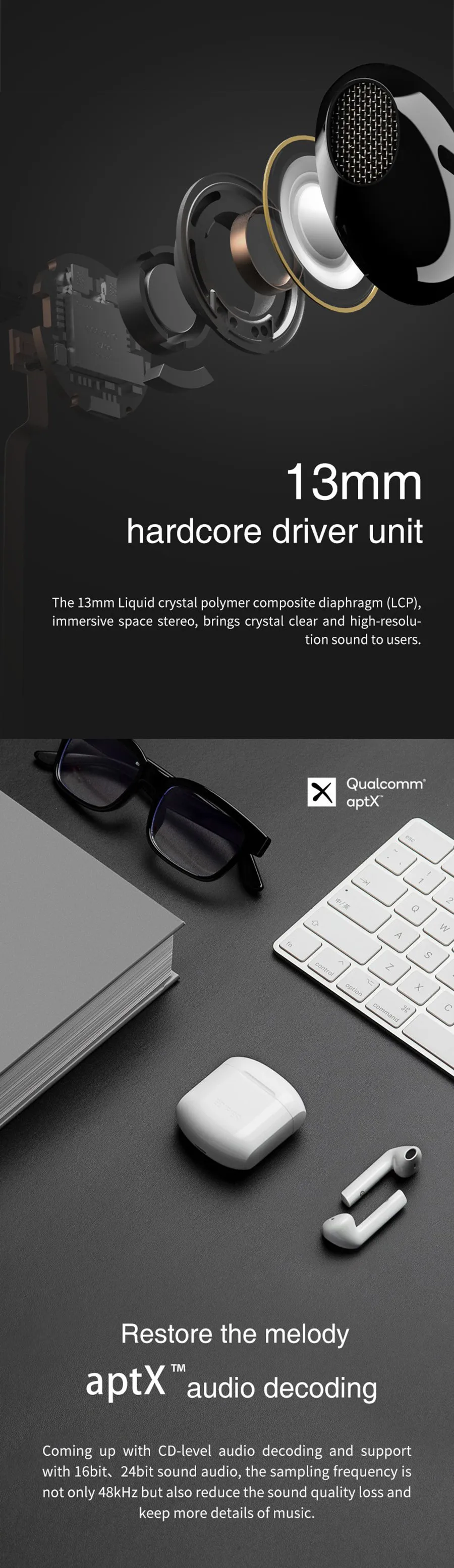 13 мм жидкокристаллическая полимерная композитная Диафрагма (LCP), иммерсивное пространство стерео, приносит кристально чистый и звук высокого разрешения для пользователей.