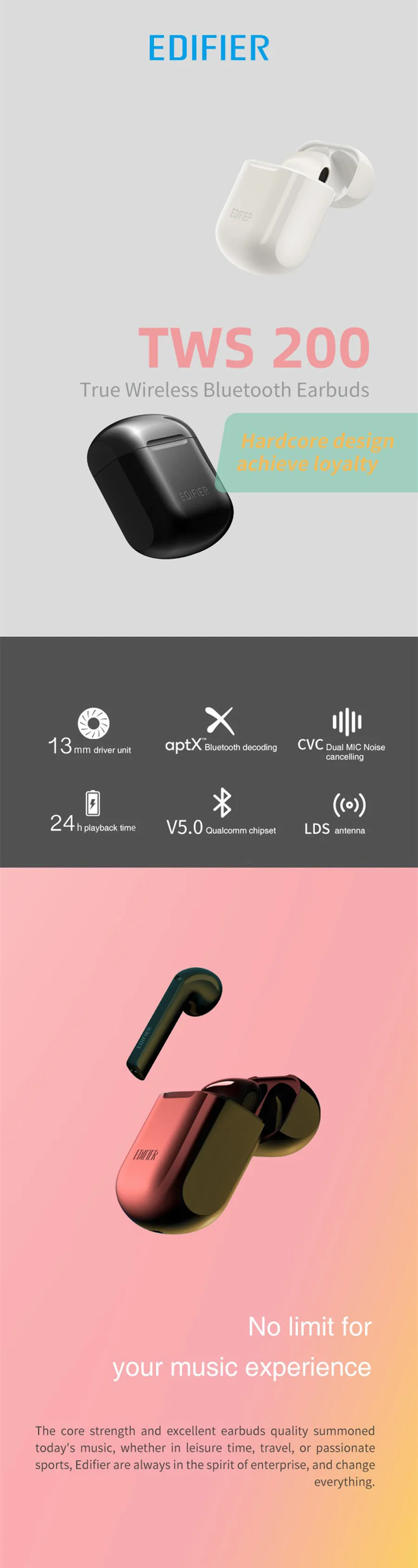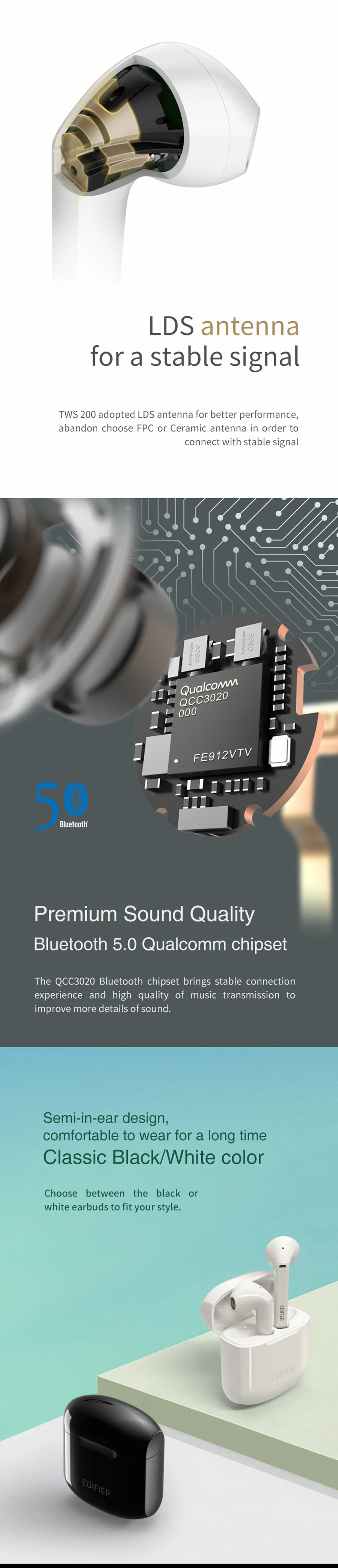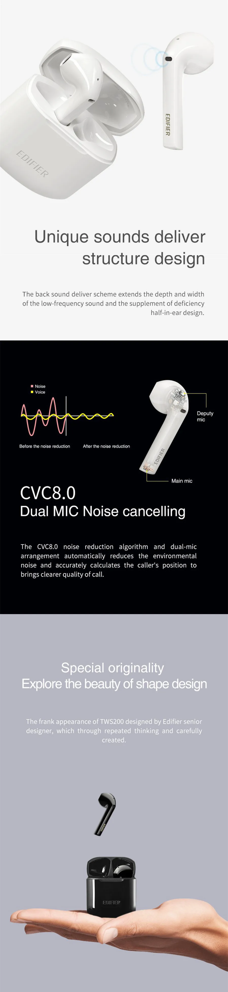Откровенный внешний вид TWS200 разработан старшим дизайнером Edifier, который через многократное мышление и тщательно создан.