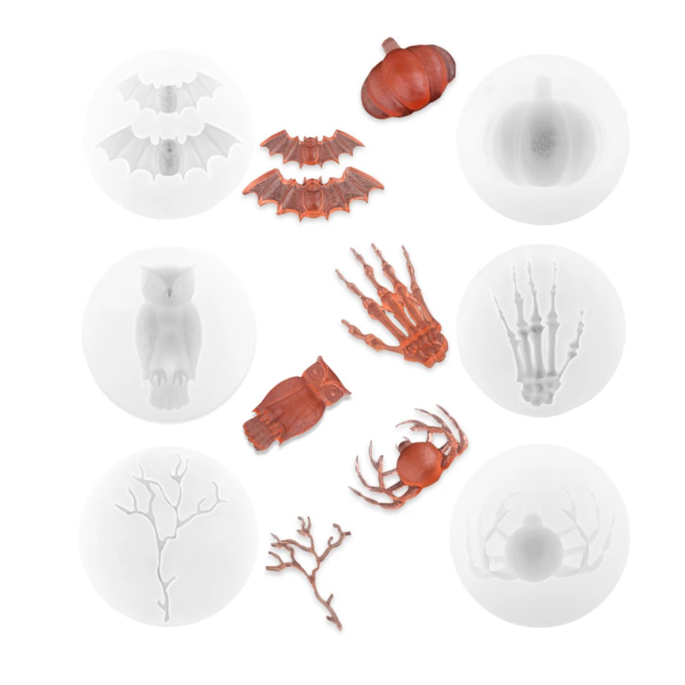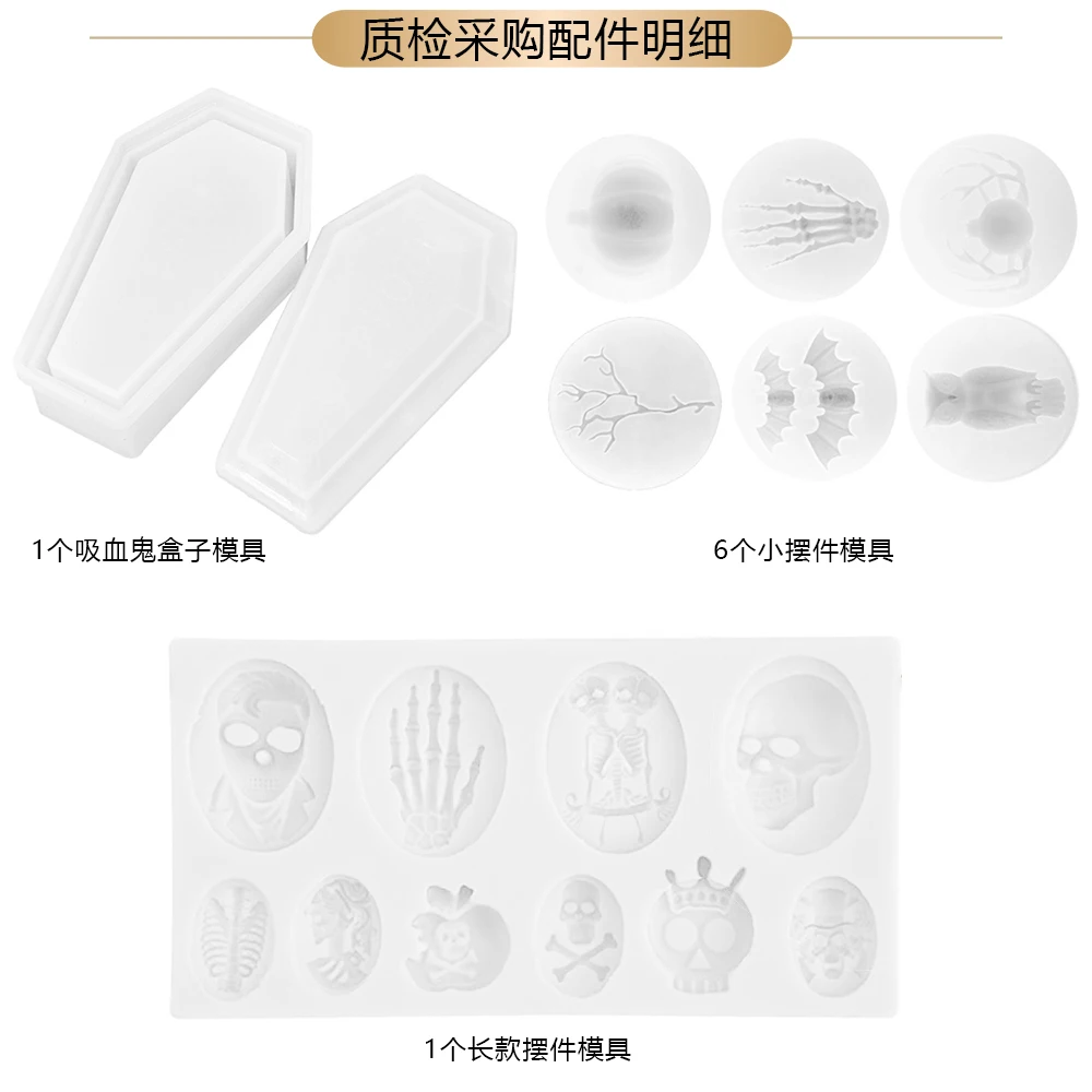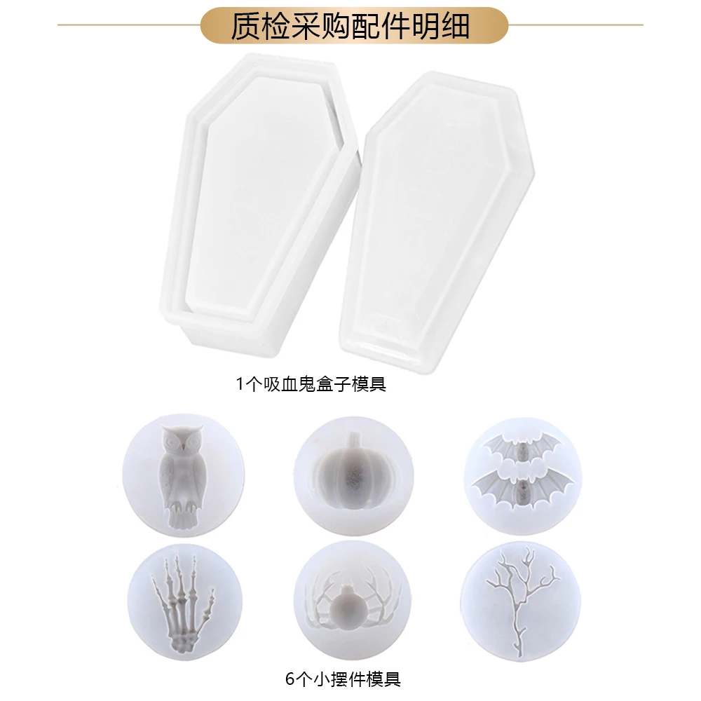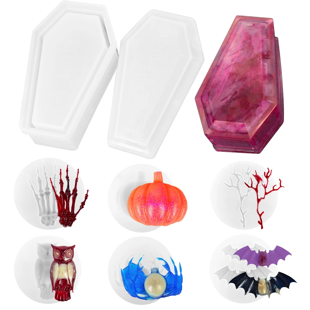 Форма из силикагеля включает в себя один маленький предмет формы коробки и три литья смолы формы, а именно летучая мышь, сова, скелет руки и формы. Все элементы готовы к фестивалям, таким как Хэллоуин. Купите его для вашего уникального Хэллоуина.