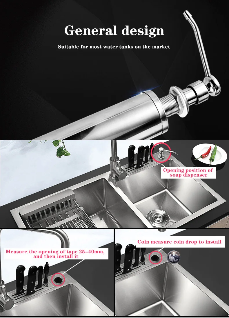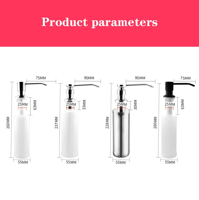 Характеристика: Материал: АБС-пластик для головки и шпильки; Пластиковый насос; ПП бутылка, коррозионная стойкость и стойкость к кислоте Применимый раковина: монтируемый диаметр отверстия (2,5-4,2 см); Монтируемый Толщина (2,6 см) Повторное использование: диспенсер для мойки мыла большой емкости (350 мл) бутылка, длинная насадка, которая достигает над раковиной Простая установка: можно заправить жидким мылом-нужно скорее снять бутылку, это займет всего несколько коротких минут, чтобы установить ее Можно повторно использовать для добавления мыла, дезинфицирующего средства для рук, шампуня, геля для душа, для любой домашней чистки, приготовления пищи