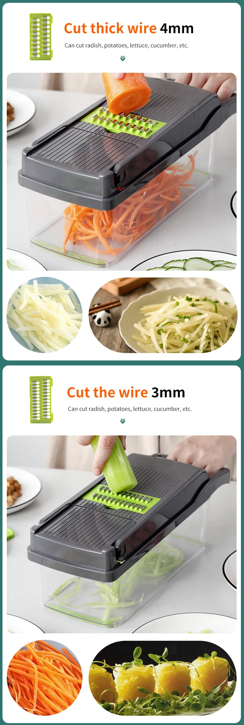 Продукт: овощерезка Myvit со стальным лезвием, мандолин, овощерезка для картофеля, морковный сыр, Овощная терка, кухонные принадлежности Кухонный помощник: Этот ручной слайсер изготовлен из пищевой нержавеющей стали и АБС-пластика без BPA. Он предлагает все функциональные возможности нескольких приборов со сменными нержавеющими лезвиями. Эти лезвия можно разрезать через все виды овощей, терка сыра, нарезка картофеля и резки фруктов, даже можно создать пастообразные овощи или пюре. Хранение сбоку: у него есть собственный контейнер для лопастей, чтобы положить, никогда не терять их или тратить время на поиск Экономьте время и деньги: С помощью этого кухонного режущего набора вы можете сэкономить 70% времени, попрощайтесь с водяными глазами, когда нарезаете лук; И поможет вам подготовить еду более элегантно.
