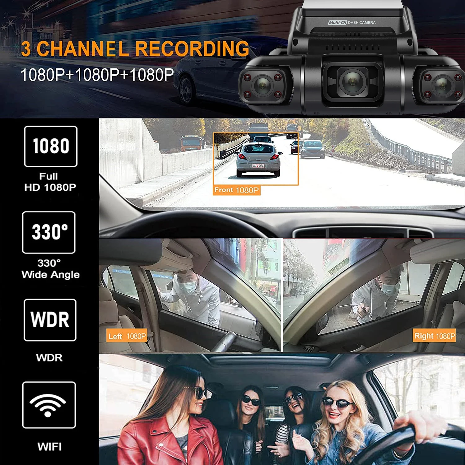 With 1080P front 170 wide angle + 1080P left 170 wide angle + 1080P right 170 wide angle +1080P Rear 170 wide angle , the driving recorder can record the super wide angle front, left and right roads at the same time. With 1080P front 170 wide-angle camera + 1080P left 170 wide-angle camera + 1080P right 170 wide-angle camera 1080P Rear 170 wide angle camera, the dash camera can record ultra-wide front and cabin at the same time.