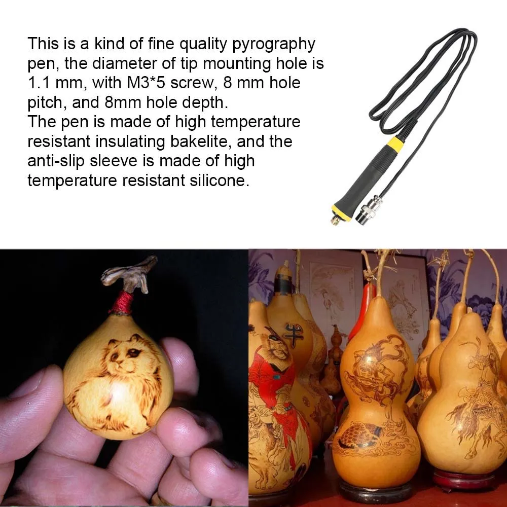 Это своего рода прекрасного качества пирографии, ручка, диаметр наконечника монтажное отверстие является 1,1 мм, с M3 * 5 винт, 8 мм расстояние между отверстиями и 8 мм Глубина отверстия. Ручка изготовлена из высокотермостойкого изоляционного бакелита, а противоскользящая втулка изготовлена из термостойкого силикона. Длина кабеля 110 мм, медный сердечник волокнистая Многожильная гибкий кабель с ПВХ изоляцией 1,5 квадратных метров, общая длина 125 мм. Подходит для работы по дереву, кожа, мебели и ремесел gourd пирография. Вы можете попробовать.