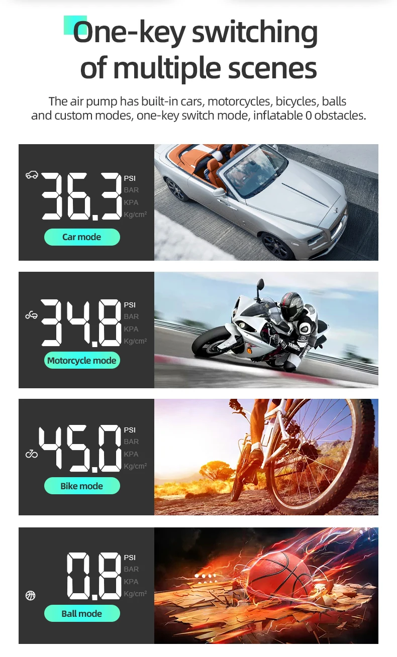 ● Около 2-3 минут для одной велосипедной шины ● Установите значение давления, и машина автоматически выключается, когда достигнет целевого значения. ● Поставляется с изысканной внутренней структурой, двигатель изготовлен из толстой меди, с батареей емкостью 6000 мАч, отвечает всем видам ежедневного использования. ● Мощный выход давления и быстрая откачка: портативный Электрический воздушный компрессор обеспечивает максимальное давление 150 фунтов на квадратный дюйм, может полностью быстро надувать плоскую велосипедную шину в 45-75 с до 5 кг-7 кг, автомобильная шина в 5-7 минутах от 0 до 230 кПа. 4 единицы измерения-PSI, BAR, KPA, KG/CM2, воздушный насос может легко устанавливать и контролировать давление в шинах, автоматически отключаться при достижении желаемого давления. ● Яркий светодиодный светильник аварийной ситуации и цифровой ЖК-дисплей: оснащенный супер ярким светодиодный светильник-вспышка помогает вам четко видеть в аварийных ситуациях ночью, также полезно для надувания ночью, ремонт в темноте или прогулки ночью. С большим цифровым ЖК-дисплеем вы будете иметь надлежащую видимость в любом состоянии.