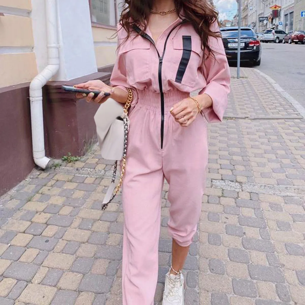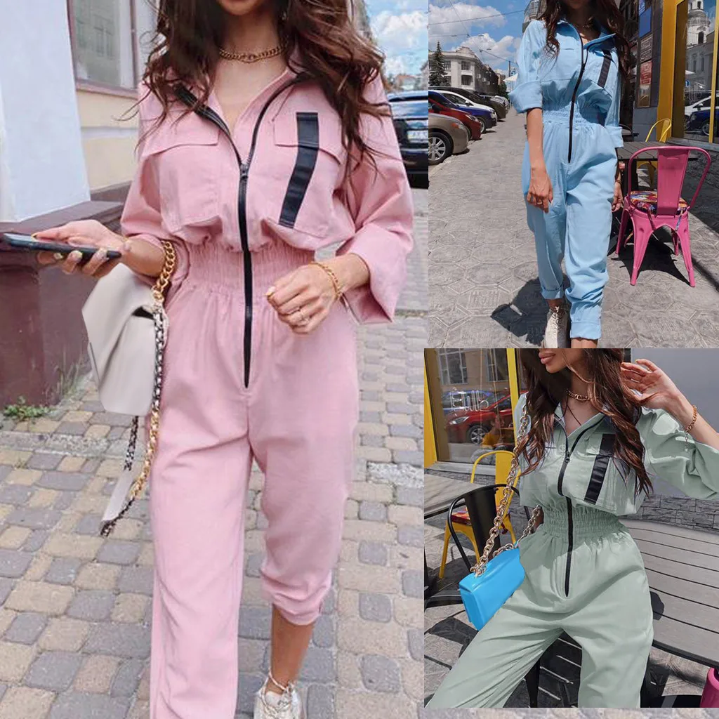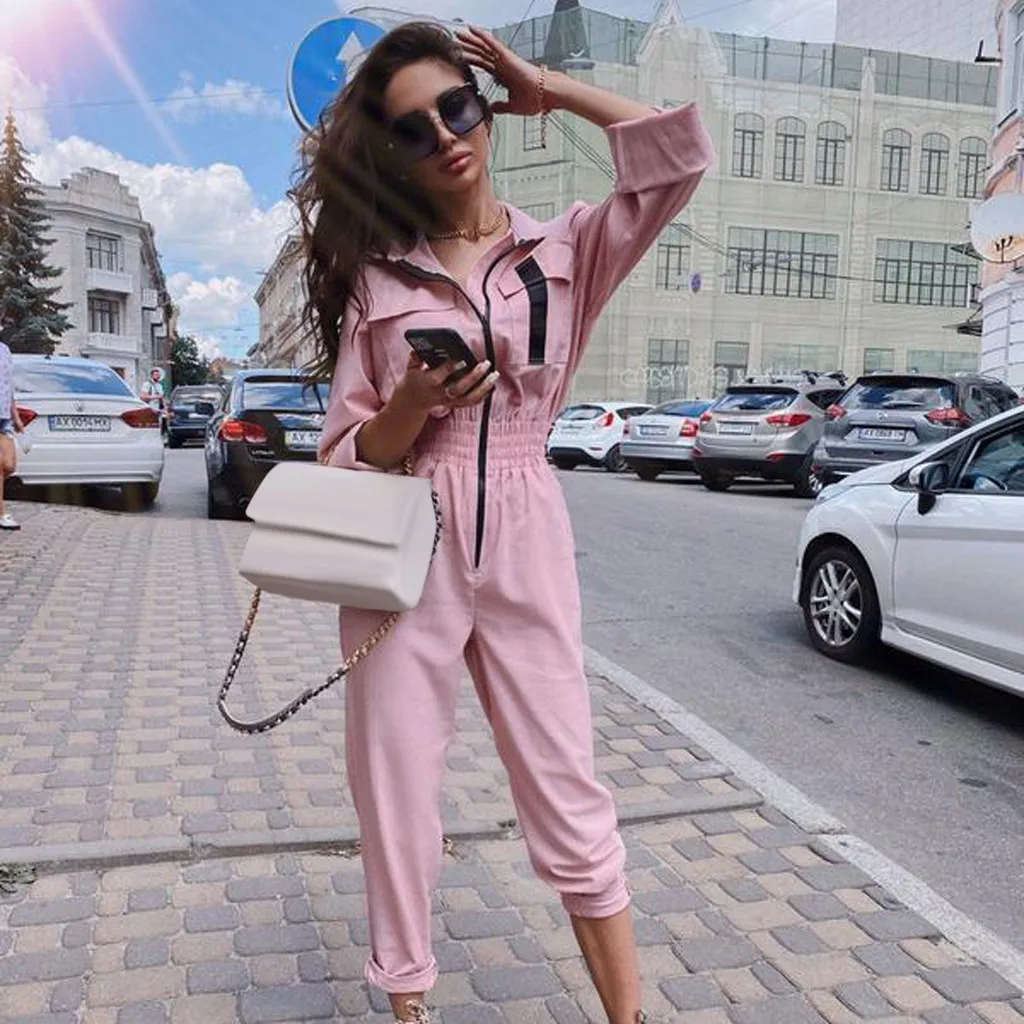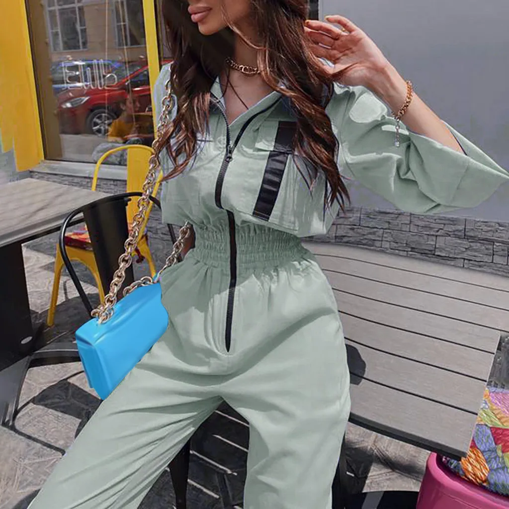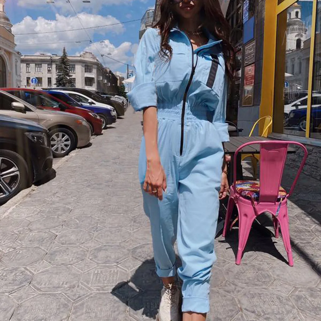 Женский модный однотонный комбинезон с длинными рукавами и карманами на талии
