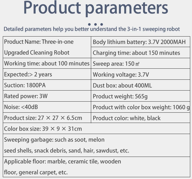 Указывая, что зарядка заряжается, а выключение означает, что зарядка завершена, а общее время зарядки составляет около 2-3 часов. Функция: Запуск одной кнопкой, подметание, уборка, пылесос, зарядка через USB, универсальное вождение, автоматическое Предотвращение препятствий, защита от падения, низкий уровень шума, интимное, низкое повторение, высокий охват
