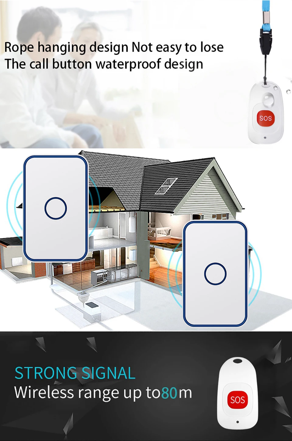 1. Кнопка поддерживает до 20 шт., а приемник поддерживает до 100 шт. 2. Если несколько кнопок соединены с одним или несколькими приемниками в одной системе, каждая кнопка может быть установлена в другой мелодии звонка. (эта функция поддерживает кнопку sos.) 3. Функция отключения памяти: Включите питание снова после выключения питания, не нужно повторно регулировать и блокировать мелодию звонка. (эта функция поддерживает кнопку sos.) 4. Дверной звонок передатчик и кнопка sos не имеют винтового патрона, и он может быть водонепроницаемым и пыленепроницаемым без резинового кольца. 5. Передатчик использует щелочную батарею 23A12V (не входит в комплект). 6. Кнопка sos использует батарею CR2032. (аккумулятор в комплект не входит). 7. Напряжение приемника: 110-220-240в. 8. Приемник доступен в различных вилках, штепсельных вилках США/ЕС/Великобритании и адаптерах Австралии, подходит для большинства стран. 9. Расстояние приема дверного звонка: 300 метров на открытой местности. 10.SOS кнопка приема расстояние: 80 метров в открытой местности. 11. На беспроводной сигнал будут влиять препятствия. Чем больше препятствий, тем серьезнее потеря сигнала. 12. Приемник имеет 5 уровней (можно отключить звук) 0-110 дБ, 60 музыки на выбор. 13. Размеры: Передатчик: 71,8x39,8x19,5 мм, Кнопка SOS: 60x34x11,5 мм, Приемник: 84x52x29мм. Примечание: кнопка не может быть размещена на железной двери, потому что это будет мешать сигналу.