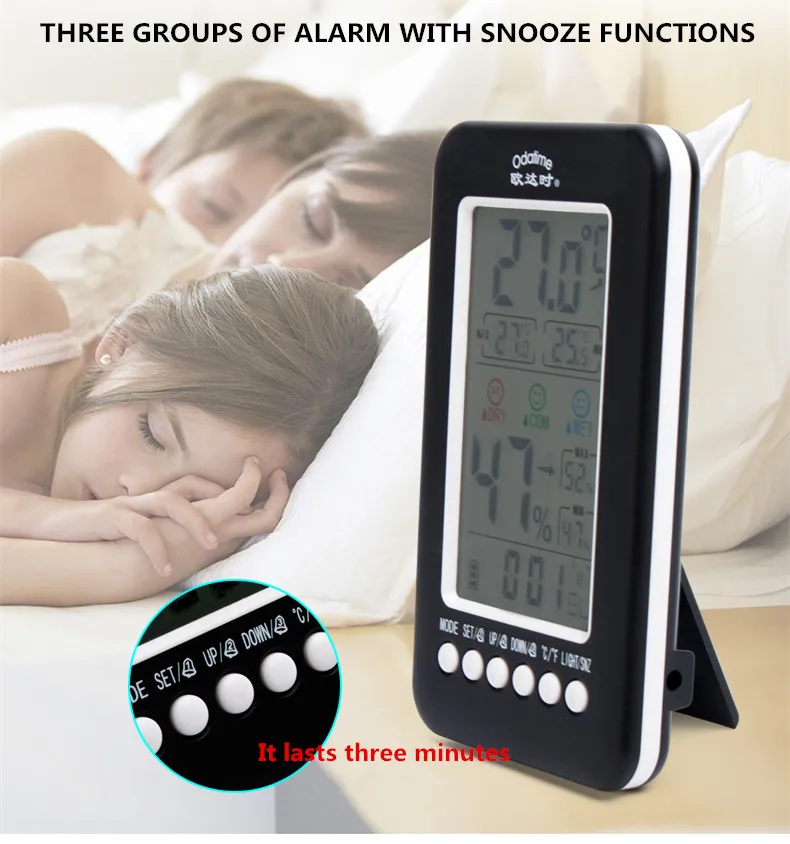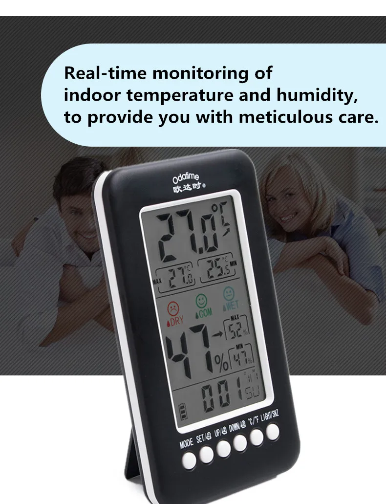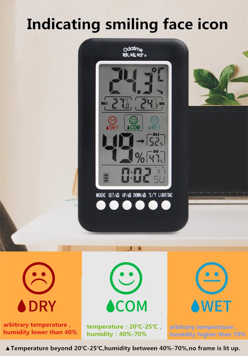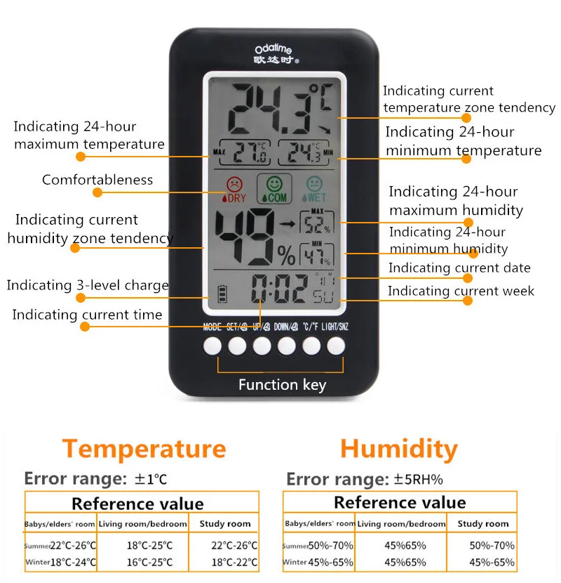 Основные функции: 1. Отображение на одном и том же экране времени, тенденции к текущей температурной зоне, Максимальная и минимальная температура и влажность в течение последних 24 часов, месяц, дата, неделя в двух цифрах, значок улыбающегося лица, 3-уровневый значок низкого заряда, год отображения экрана Divi, 3 набора времени тревоги; 2. Температура в помещении; Рабочий диапазон: -10 ~ 60 ℃ (14 ~ 140 ℉ ) ; Когда температура ниже-10 ℃, это означает-10 ℃ (14 ℉ ), когда температура выше 60 ℃, это означает 60 ℃(140 ℉). 3. Влажность в помещении; Рабочий диапазон: 20 ~ 99% относительной влажности; В тех случаях, когда влажность ниже 20%, это означает 16%, когда влажность если сумма вашего заказа превышает 99%, это означает 99%; 4. Время обнаружения: сканирование температуры и влажности один раз в 30 секунд; 5. Дата: 1 января 2000 года-31 декабря 2099 года 6. 3 комплекта сигнализации с повтором 7. Функция акустического управления 8. Функция подсветки Спецификация: Размер изделия: 150x85x23мм Вес нетто: 145 г Вес посылка: 171 г Цвет: черный Питание: 3 батарейки типа AAA (не входят в комплект) Посылка включает в себя: 1 * Многофункциональный термометр гигрометр 1 * Руководство пользователя на английском языке Примечания: 1. Из-за правил логистики, мы не можем предоставить батарею, пожалуйста, возьмите с собой. 2. Не разбирайте изделие самостоятельно. 3. Не помещайте продукт в жаркое, влажное, пыльное место или место с коррозионным газом, чтобы избежать повреждения электронных компонентов. 4. В то время как индикация размыта, пожалуйста, измените батарею, и, пожалуйста, удалите батарею, если она не будет использоваться в течение длительного времени, в чехол, который аккумулятор протекает свою жидкость и вызывает повреждение продукта.