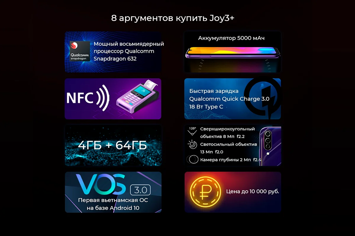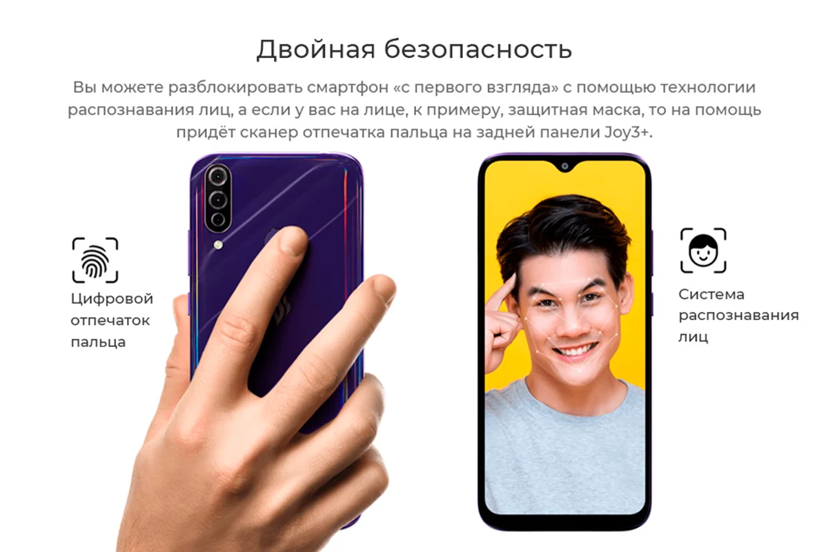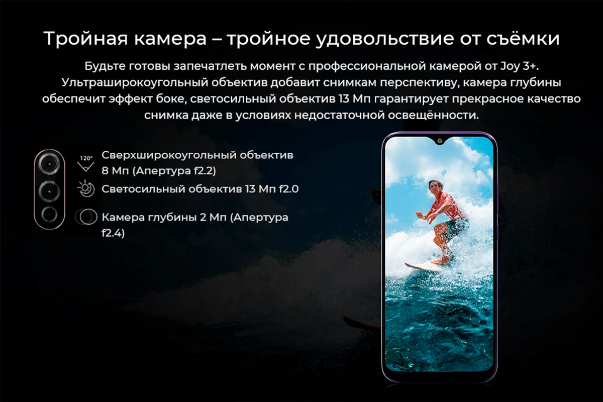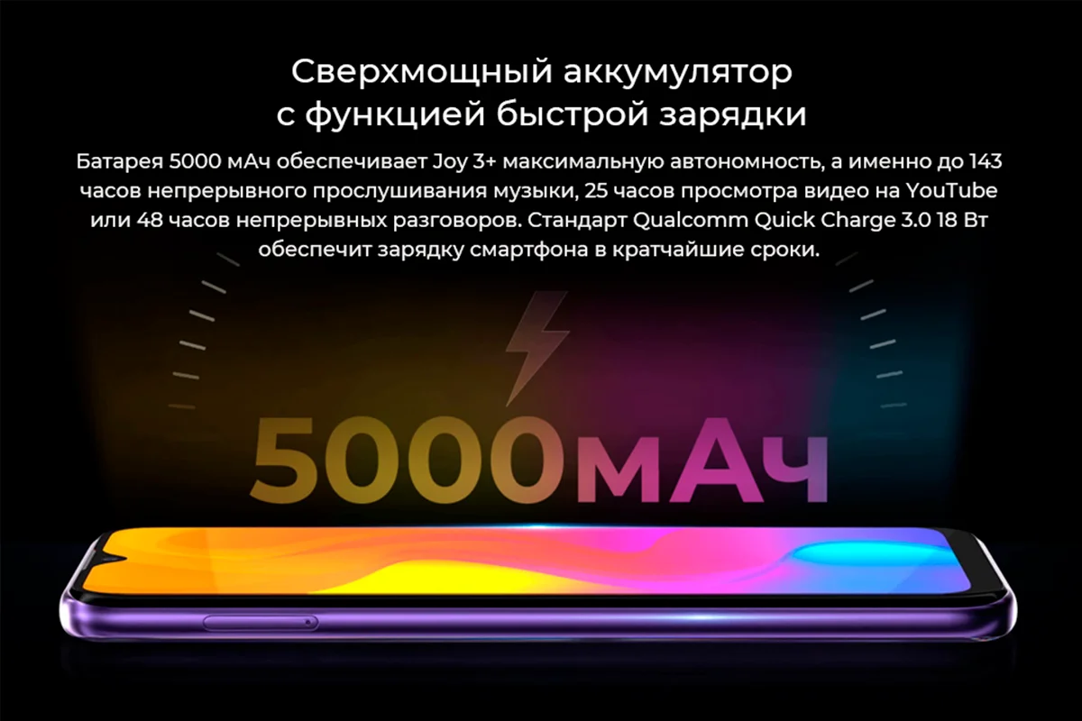 Безрамочный IPS дисплей Joy 3+ с диагональю 6.52" и разрешением HD+ гарантирует прекрасные визуальные впечатления. Смотрите любимые фильмы, играйте в игры и записывайте видеоролики на новом уровне. Гарантируем - вам больше никогда не захочется смартфон с экраном меньшего размера. Будьте готовы запечатлеть момент с профессиональной камерой от Joy 3+. Ультраширокоугольный объектив добавит снимкам перспективу, камера глубины обеспечит эффект боке, светосильный объектив 13Мп гарантирует прекрасное качество снимка даже в условиях недостаточной освещенности. Батарея 5000 мАч обеспечивает Joy 3+ максимальную автономность, а именно до 143 часов непрерывного прослушивания музыки, 25 часов просмотра видео на YouTube или 48 часов непрерывных разговоров. Стандарт Qualcomm Quick Charge 3.0 18 Вт обеспечит зарядку смартфона в кратчайшие сроки.