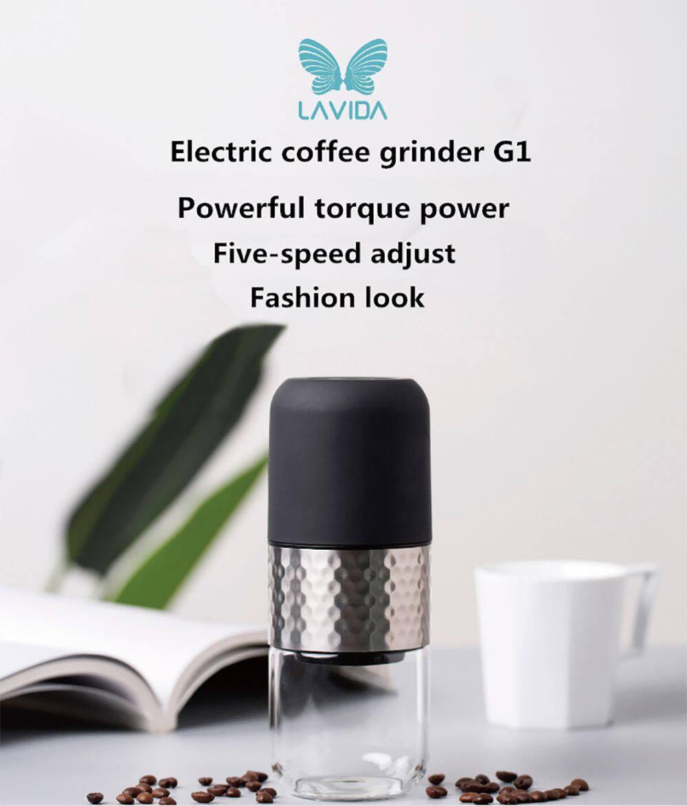 LAVIDA электрическая кофемолка G1-это первая портативная перезаряжаемая кофемолка. Он может быстро измельчить в 80s. Его можно назвать профессиональной кофемолкой нового поколения. Полученный кофейный порошок является более однородным, и процесс экстракции кофе более стабильный.
