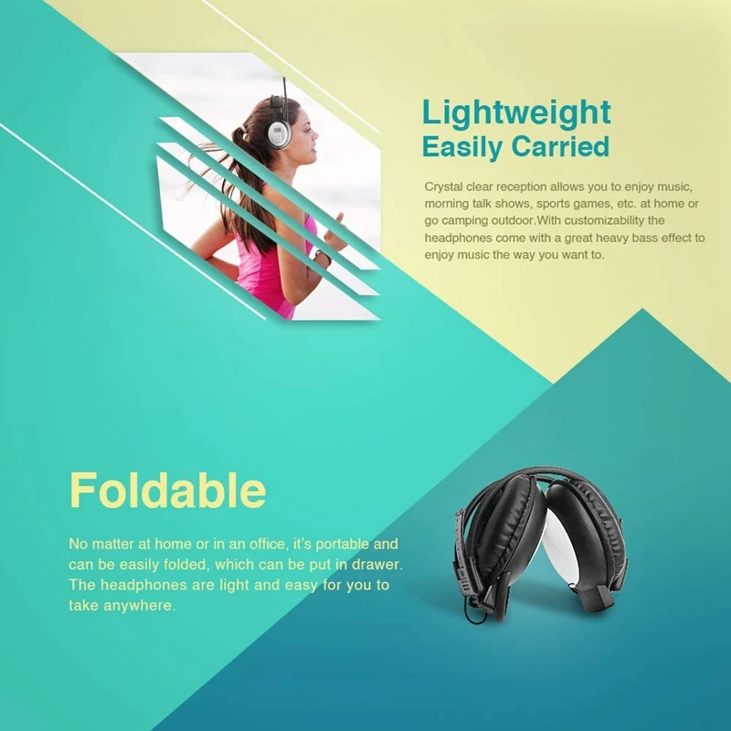 Компактный и легкий: Возьмите их на ходу! Эти наушники были разработаны, чтобы быть легко портативными и функциональными. Наушники-это светильник, который легко брать с собой куда угодно. Будь вы на пробежке или прогуляетесь, возьмите их с собой, чтобы сделать его более веселым! Отличный способ держать в курсе и наслаждаться радио во время выхода и около.