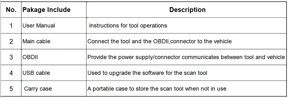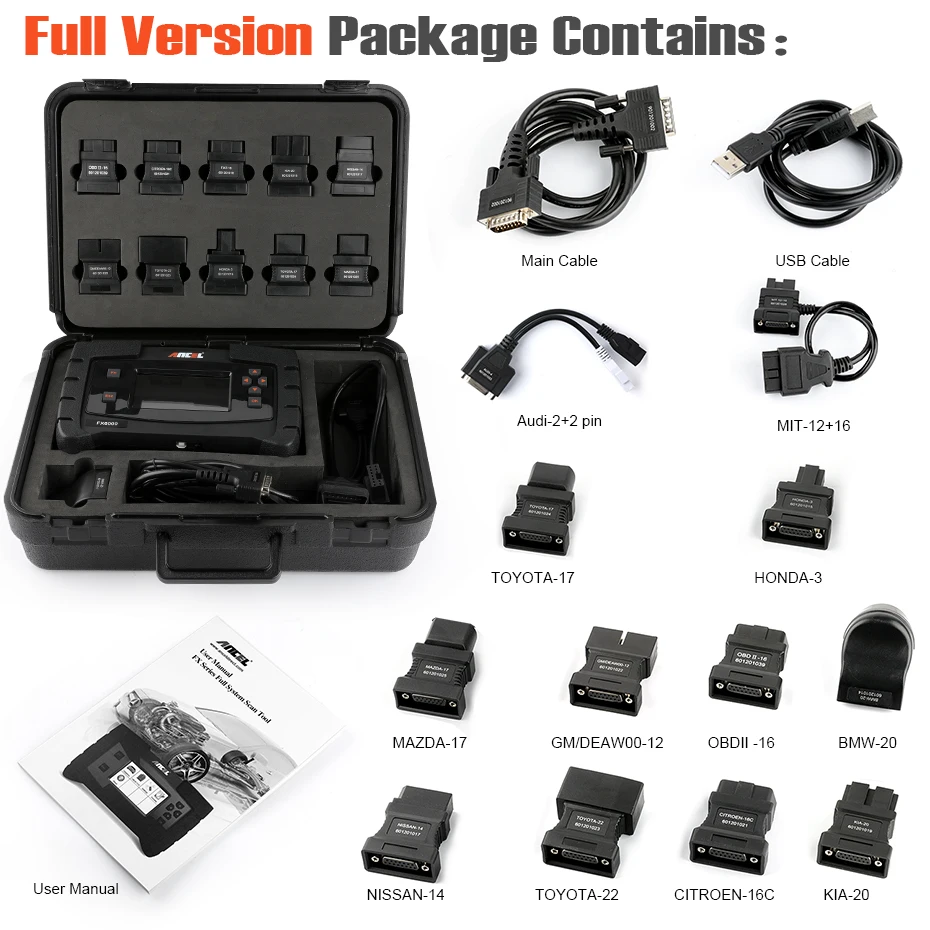 Базовая версия пакета включает: 1 * сканер Ancel FX6000 1 * основной кабель 1 * OBDII-16 1 * Citroen-16C 1 * USB кабель (для обновления) 1 * Руководство пользователя 1 * Пластиковый футляр (ЭВА) Полная версия упаковки включает: 1 * сканер Ancel FX6000 1 * основной кабель 1 * OBDII-16 1 * Citroen-16C 1 * USB кабель (для обновления) 1 * Audi-2 + 2 Pin-код 1 * MIT-12 + 16 1 * Nissan-14 1 * Toyota-22 1 * Toyota-17 1 * Honda-3 1 * KIA-20 1 * BNW-20 1 * GM/Deawoo-12 1 * Mazda-17 1 * Руководство пользователя 1 * пластиковая коробка