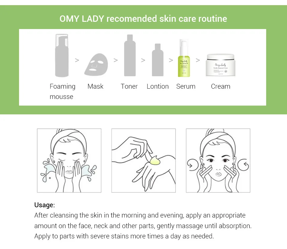 После очищения кожи утром и вечером нанесите необходимое количество на лицо, шею и другие части, Аккуратно помассируйте до впитывания. Наносите на части с сильными пятнами больше раз в день по мере необходимости.