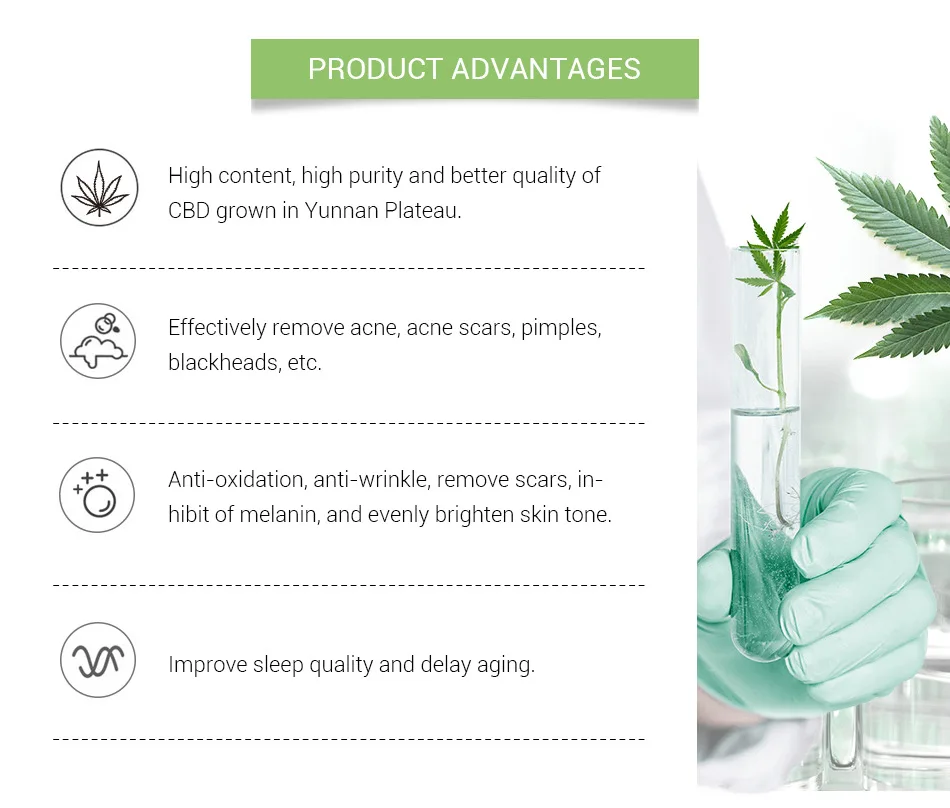 ▶Ингредиент CBD, используемый в продуктах по уходу за кожей, обладает следующим основным эффектом: восстанавливает глубокие мышечные клетки, глубоко очищает кожу, противовоспалительный и Антибактериальный, регулирует водно-Масляный баланс кожи; Отбеливание, против морщин, против старения, удаление акне, веснушек, прыщей, черных точек и т. д. он также обладает спокойным, успокаивающим действием, а также действием на здоровье, как средство для сна и т. д.