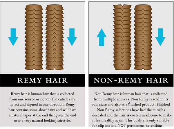 Волосы Remy собраны и сортируются из разных источников с корнем Remy волосы дороже и выглядят более естественно из-за утомительного процесса, который волосы проходят, чтобы не повредить кутикулу. Обычно необработанные волосы или волосы, которые были минимально обработаны для защиты целостности волос, имеют кутикулу в такте.