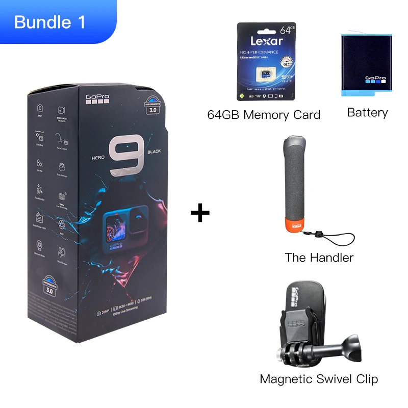 1 * GoPro Hero 9 черный официальный стандарт Карта памяти 1*64 Гб 1 * аккумуляторная батарея (официальный аксессуар GoPro) 1 * обработчик (официальный аксессуар GoPro) 1 * Магнитный поворотный зажим (официальный аксессуар GoPro)
