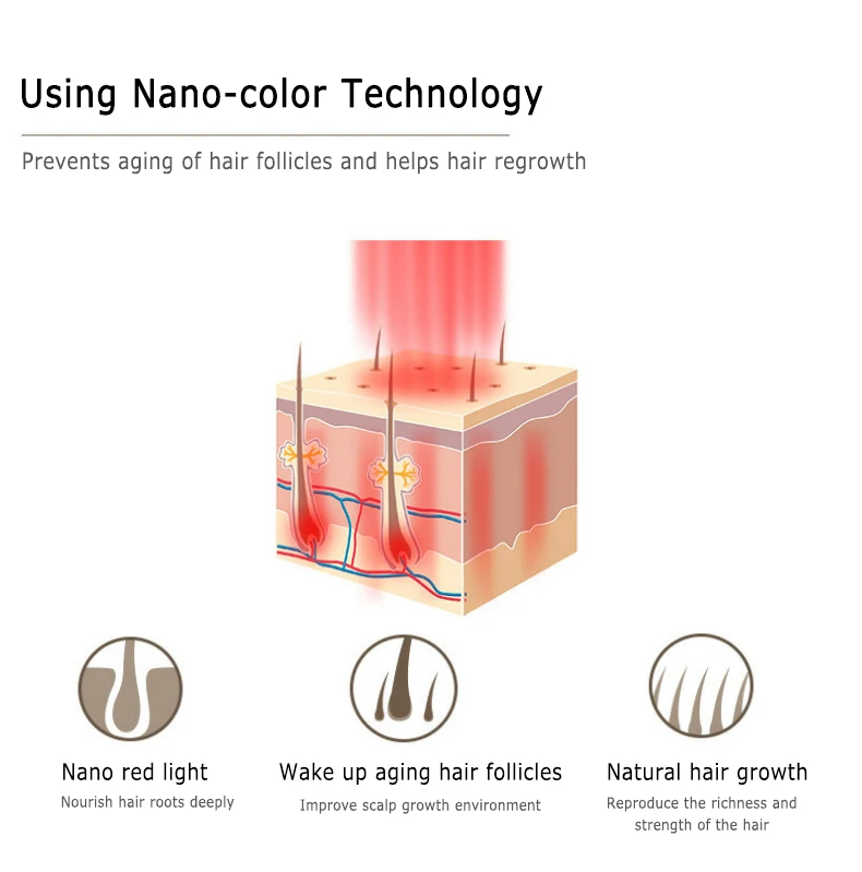 Nano-red light can directly reach the hair nipple under the skin. It has obvious anti-aging effect and can alleviate the hair loss caused by the decrease of collagen.