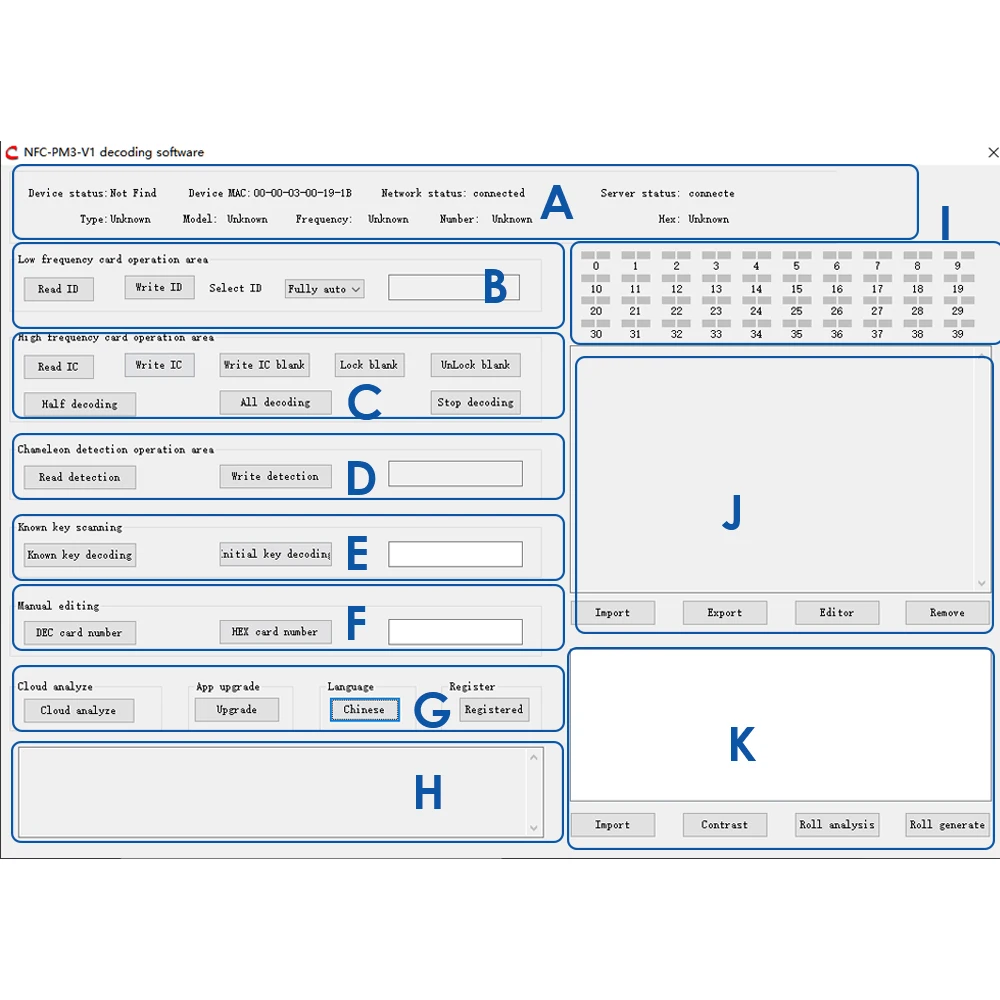Область А: Отображение информации об устройстве, информации о подключении и информации о чтении карты.Область B: работа с идентификационной картой.Область C: Работа карты IC.Зона D: этот детектор работает (не открыт).Область E: Используйте известный пароль для расшифровки IC-карты.Область F: введите номер карты. Вы можете выбрать между десятичными и шестнадцатеричными номерами карт.Область G: Пользовательские настройки и анализ данных. (Еще не открыт)Область H: отображение состояния работы.Область I: показывает сектора, треснувшие IC-картой. Карта S70 имеет в общей сложности 40 секторов. Карта S50 имеет 16 секторов. Номер представляет собой номер сектора, обозначающий сектор. Левый блок обозначает ключ A, а правый блок обозначает ключ B. Когда карта или декодирование успешно выполнены, она зеленая, когда декодирование отказывает, она Красная, а желтое мигание указывает на то, что процесс декодирования продолжается.Область J: Отображение данных блока декодирования IC.Область K: данные карты IC могут быть импортированы.