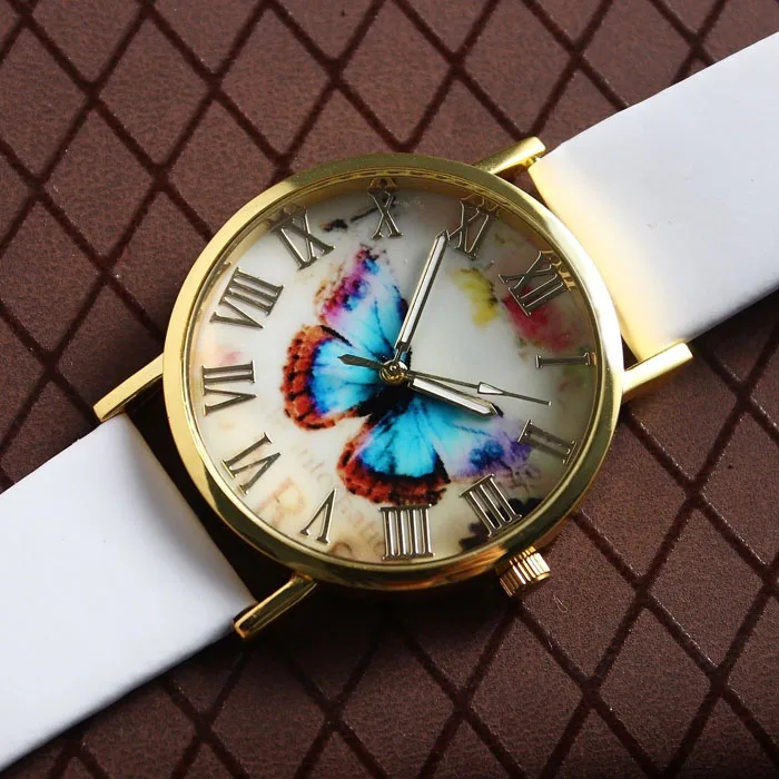 Женская мода бабочка стиль кожаный ремешок аналоговые кварцевые наручные часы