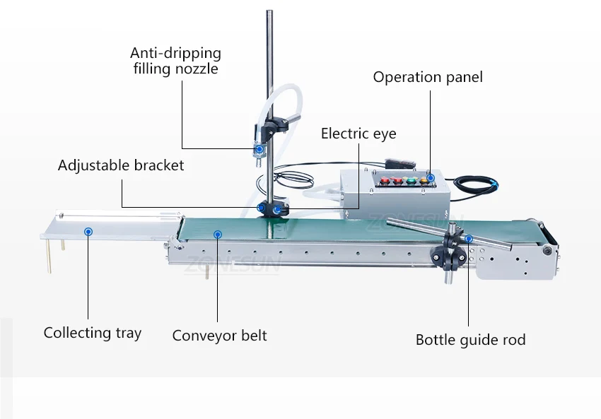 Параметр:Машинный насос: мембранный насосНапряжение: 220 В/110 в 50-60 ГцМощность: 60 ВтМаксимальный объем заполнения: 3лВысота бутылки: ≤ 30 смДиаметр бутылки: ≤ 8,1 смВходное напряжение устройства питания: 100-240 ВВходное напряжение машины: 12 В 5A DC источник питанияВремя заполнения: 0-999sСкорость заполнения: 0-99Точность заполнения: ± 1%Интеллектуальное измерение расстояния: ≤ 1 смФункция защиты от капель: доступнаПрименение:Его можно использовать для заполнения жидкости с низкой вязкостью, которая не содержит частиц, таких как вода, напитки, соус, сок, соевое молоко, тонер и т. Д. НАЛИВНАЯ жидкость должна быть без пены. Эта машина маленькая, что является идеальным выбором для небольшого производства.Описание:1. Заполнение сопла машины имеет функцию анти-капания, которая может держать конвейер чистым.2. Оснащен умным глазом, что делает процесс наполнения более эффективным.3. С функцией термостойкости, может заполнить жидкость, которая составляет около 100 ℃.4. Впускные и выпускные трубы могут быть удалены и заменены.5. Микрокомпьютерная система управления, самая высокая точность синхронизации достигает 0,1 во-вторых.6. Водонепроницаемая конвейерная лента.Примечание:1. Нагрузка, которую может нести конвейер, должна быть в пределах 3 кг.2. Лучше, чтобы расстояние между электрическим глазом и бутылкой было в пределах 1 см.