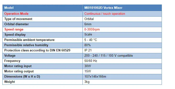 Operation mode:Continuous/touch operation Type of movement:Orbital Orbital diameter:6mm Speed range:0-3000rpm Speed display:Scale Permissible ambient temperature:5 - 40 °C Permissible relative humidity:80% Protection class according to DIN EN 60529:IP 21 Motor rating input:30W Motor rating output:15W