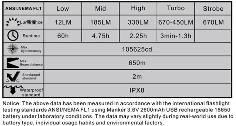 Особенности Излучатель: 1 * ORM кВт CSLNM1.TG (холодный белый светильник); / 1 * ORM KR CSLNM1.23 (красный светильник) Аккумулятор: 1x18650 (в комплекте одна аккумуляторная батарея USB 18650) Максимальная мощность: 670 люменов (холодный белый светильник); / 250 люменов (красный светильник) Максимальная интенсивность луча: 105625cd (белый светильник) Максимальное расстояние луча: 650 метров (холодный белый светильник); / 350 метров (красный светильник) Максимальное время работы до 60 часов Рабочая Напряжение: 2,8-4,2 V Драйвер: наиболее эффективная схема постоянного тока Защита от обратной батареи Защита от перегрузки и перезарядки Водонепроницаемость: IPX-8(2 метра под водой) Ударопрочность: 2 метра Размер: 134 мм (длина) x 40 мм (диаметр головки) Вес: 131 грамм (с батареей) Аксессуары: зажим из нержавеющей стали * 1, уплотнительное кольцо * 1, ремешок * 1, руководство пользователя * 1, usb-кабель * 1, литий-ионный аккумулятор 18650 USB * 1 Уровни яркости и время работы (белый светильник) Низкий: 12 лм 60 часов, Средняя: 185лм 4,75 часов, Высота: 330лм 2,25 часов, Турбо: 670-450лм 3 мин-1.3ч, Стробоскопический режим: 670lm