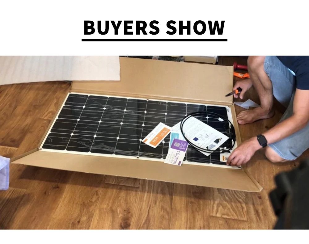 1. 1 шт 100 Вт солнечная панель 2. 10 А 12 В/24 В контроллер заряда 3. 1 комплект удлинительного кабеля с PV разъемом 4. 1 комплект кабеля с зажимом типа крокодил (подключение к батарее)