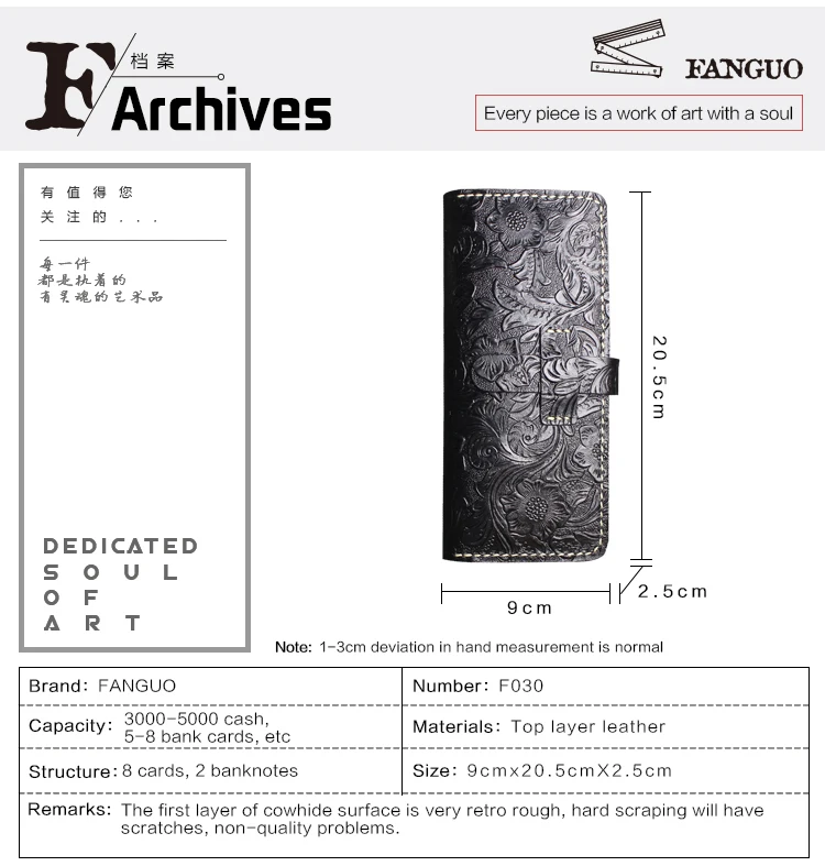 Спецификация: Материал: коровья кожа (натуральная кожа) Подкладка: натуральная кожа Стиль: винтажный, простой, повседневный Вес: около 0,13 кг Размеры: 20,5*9*2,5 см Пол: для мужчин, wo Men Особенности: (1) есть 8 отделений для карт и 2 сумки (2) ручная работа и использование hasp. (3) кожа Прочная и прочная, оригинальный цветочный дизайн. (4) по этой ссылке будет отправлена Подарочная коробка вместе. Это хороший продукт в качестве подарка. Примечание: (1) есть много разных цветов. Пожалуйста, выбирайте внимательно. (2) при разнице в способе измерения допускается отклонение в размере на 1-3 см. (3) продукт принимается в натуральной форме, но могут быть некоторые хроматические аберрации под другой светильник и dmonitor, пожалуйста, поймите. (4) текстура воловьей кожи немного отличается для разных частей коровы; Например, текстура шеи и ягодиц коровы будет толще, И текстура других частей коровы будет тоньше. Пожалуйста, поймите.