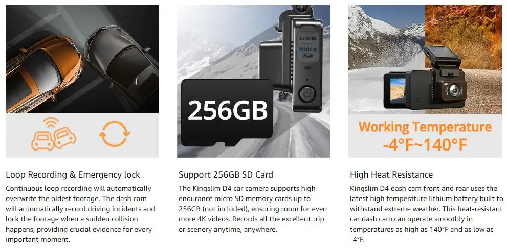 【UHD 4K + 1080P & QHD 2,5 K + 1080P 】-Двойной видеорегистратор Kingslim D4 4K может одновременно записывать видео спереди 4K(2160p @ 25fps) и задним разрешением 1080P, четко фиксируя номерные знаки и дорожные знаки. Разрешение Ultra HD 4K также обеспечивает высокую четкость для любителей путешествий. Вы можете переключиться на передний вид в QHD 2,5 K (2560x1440 @ 30fps) и задний вид в full HD 1080P (1920x1080 @ 25fps) для ежедневной записи видео, захват деталей QHD, чтобы помочь восстановить истинность.
