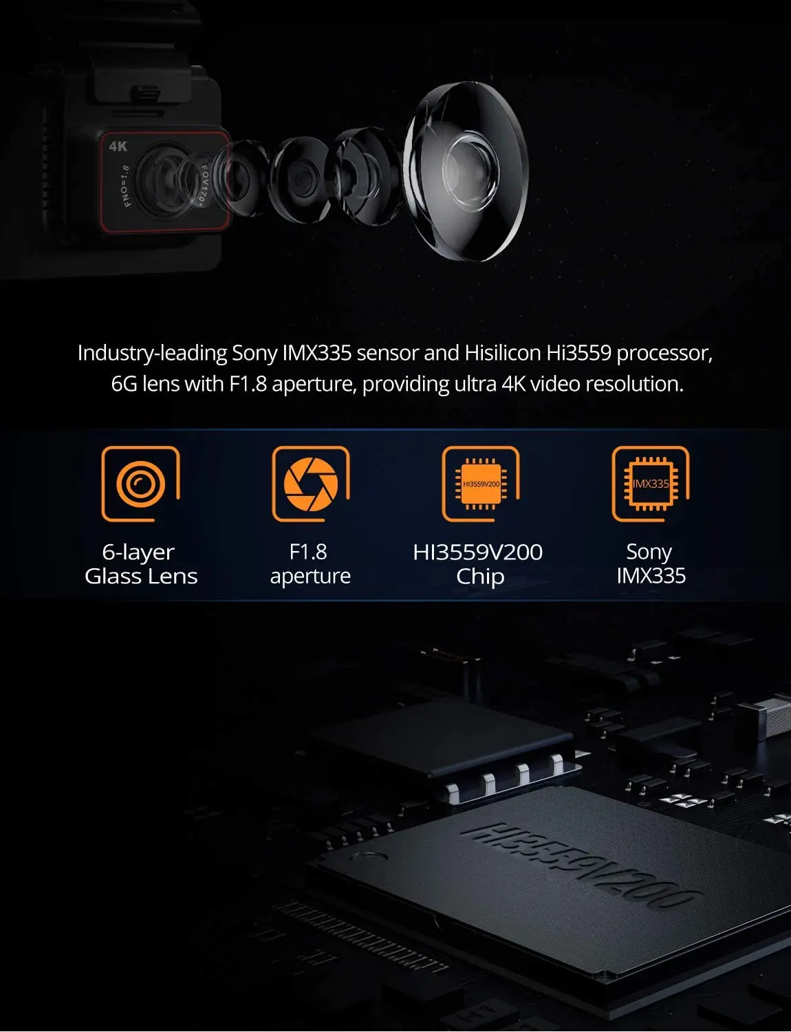 Оснащенный фронтальной камерой 4K и тыльной камерой 1080P, ваша видеорегистратор будет записывать подробные кадры днем и ночью. Сенсорный экран 3 "позволяет легко управлять. Wi-Fi и GPS означает, что вы можете подключиться к смартфону и легко спланировать свой маршрут. Поделитесь видеозаписью 4K в социальных сетях.