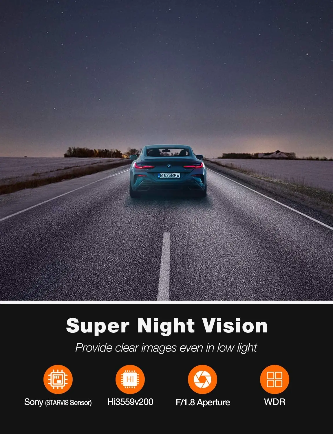 【Датчик Sony и ночное видение 】-Kingslim dual dash cam использует ведущий в отрасли датчик Sony IMX335 STARVIS и процессор Hisilicon Hi3559. Благодаря суперночному видению, диафрагме f/1,8 и технологии WDR вы можете записывать Потрясающие детали даже в условиях, когда светильник находится на низком уровне. С передним 170 ° и задние 150 ° супер-широкий обзор под разными углами и 6 с двухслойным стеклом фиксированный фокус объектива, он дает вам максимальный охват дороги и значительно улучшает ночное видение, предоставление четких и четких изображений и видео.