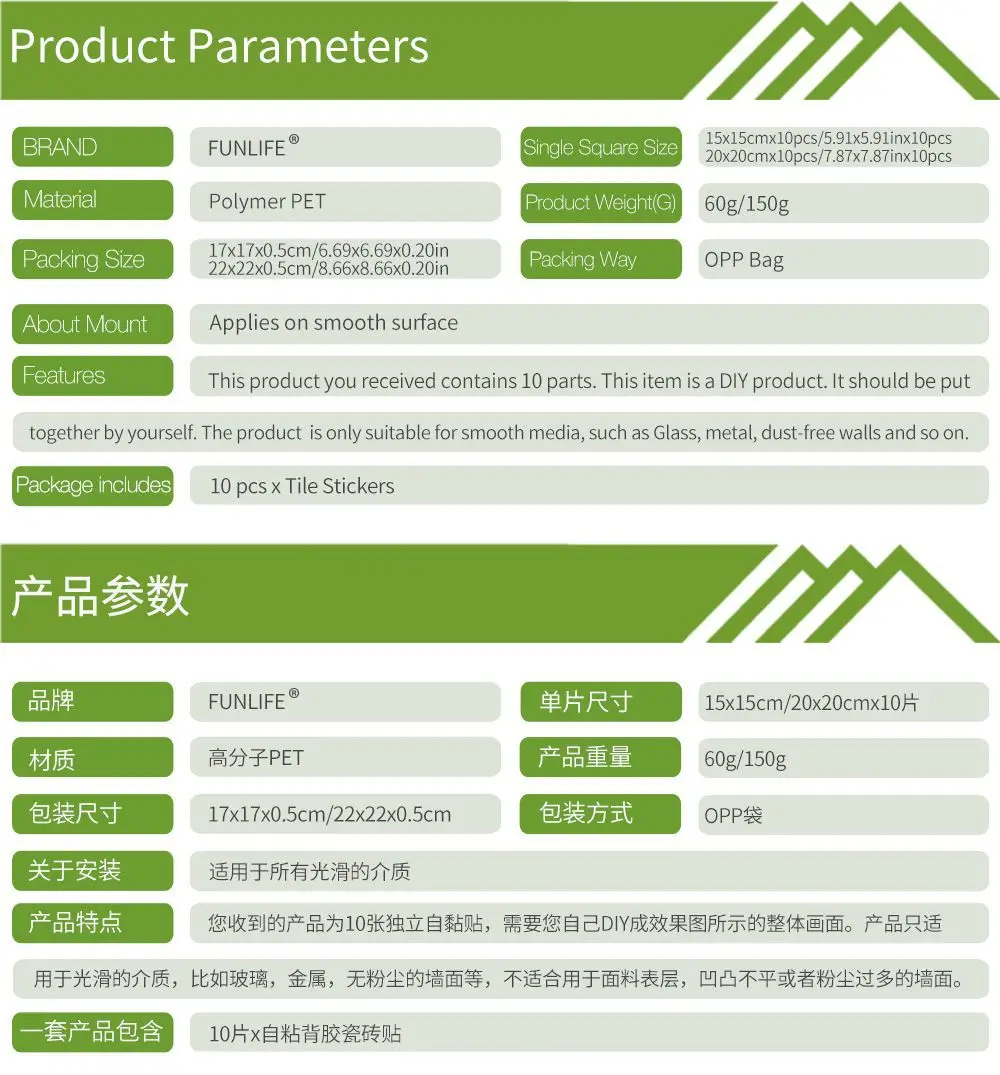 Продукт: клейкие наклейки на стену Характеристики: водонепроницаемый/комбинированный Размеры: 15*15 см/5,91*5,91 дюймов Количество: 10 шт./компл. Упаковка: OPP мешок Внимание: продукт подходит только для гладких сред, таких как стекло, керамическая плитка, металл, стена без пыли и так далее.