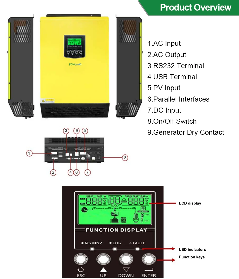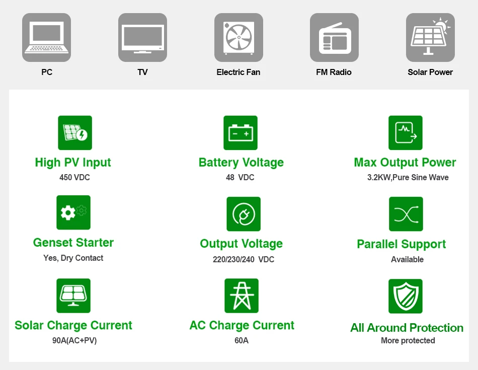 Гибридный солнечный инвертор (вкл/выкл инвертор сетки). Коэффициент выходной мощности PF = 1,0.