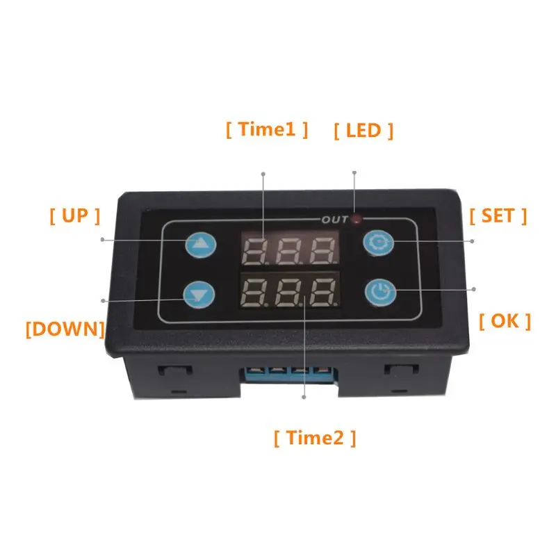 Настройка времени: короткое нажатие кнопки настройки, цифровая трубка T1 будет мигать. В период мигания время синхронизации T1 устанавливается путем добавления или вычитания кнопки. После настройки нажмите кнопку настройки снова, цифровая трубка T2 будет мигать, и кнопка будет добавлена или вычтена во время мигания. Установите время синхронизации T2. Существует два способа сохранения данных после настройки. Первый может ждать 6S, цифровая трубка перестает мигать, система автоматически экономит время установки, а второй может снова нажать кнопку настройки, чтобы сохранить данные.