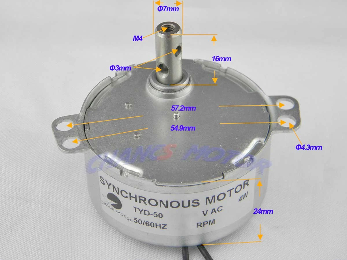 Название продукта: Синхронный двигатель; Модель: TYD-50; Диаметр вала: 7 мм; Длина вала: 16 мм; Направление: CW/CCW (неконтролируемое); Напряжение: 110 В переменного тока; Скорость: 7,5-9 об./мин.; Мощность: 4 Вт; Крутящий момент: ≤ 3,6 кг * см; Частота: 50/ 60 Гц; Посылка: 2 синхронных двигателя;