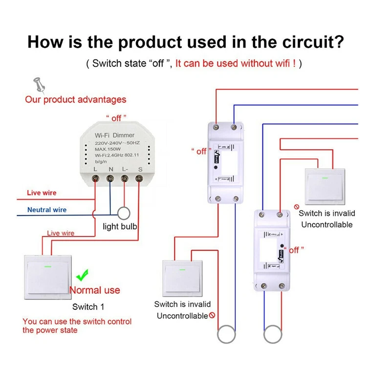 Этот модуль диммера Wi-Fi предназначен для преобразования вашего традиционного переключателя в переключатель Wi-Fi, что позволяет подключенному устройству управлять через смартфон, а также традиционный переключатель.