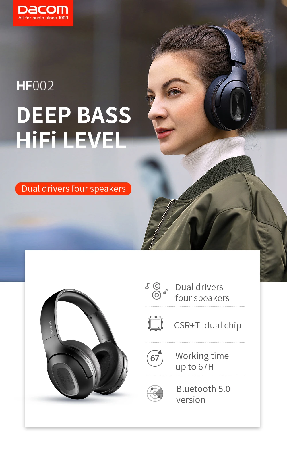 Бренд: DACOM Модель: DACOM HF002 Версия Bluetooth: Bluetooth 5,0 Протокол Bluetooth: HSP/HFP/A2DP/AVRCP Емкость аккумулятора: 1200 мА · ч Время работы в режиме ожидания: около 67 часов 2400 часов Время зарядки: около 2,5 часов сопротивление: 32ohm Чувствительность: 106db Частотный диапазон: 20 Гц-20 кГц аудио Длина кабеля: 1,1 м/3.6ft с одновременное подключение двух телефонов да Функция: следующая/Предыдущая песня, ответить/повесить телефон