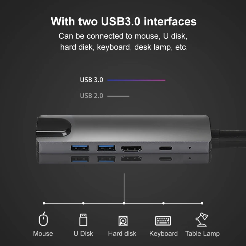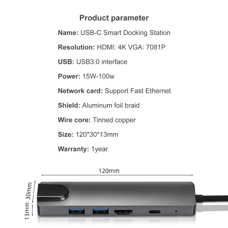 Название продукта: Type-C до USB3.0 * 2 + HDMI + RJ45 + Type-C PD док-станция (5 в 1)