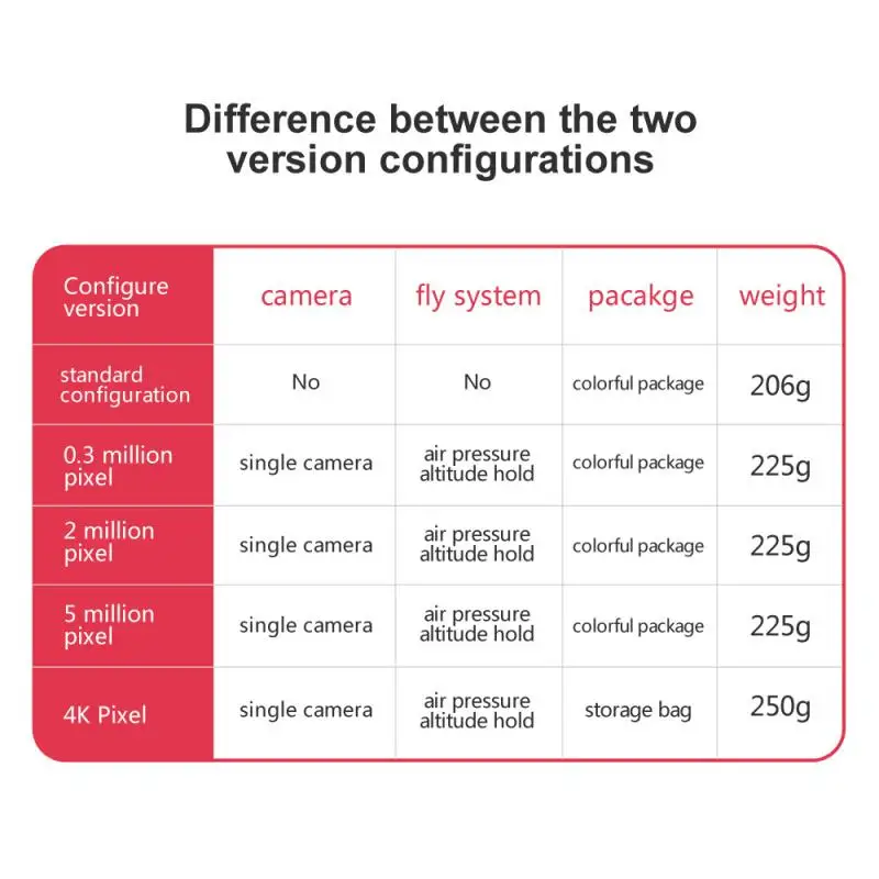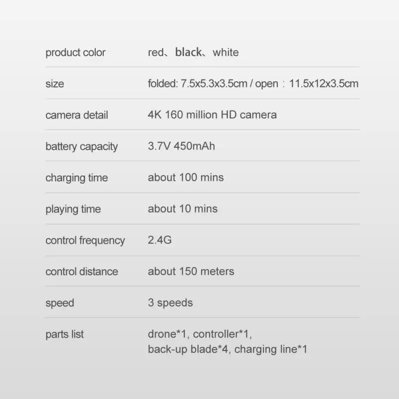 Квадрокоптер * 1 пульт дистанционного управления * 1 батарея * 1 защитное кольцо * 4 полоски вентилятора * 4 USB-кабеля для зарядки * 1 руководство * 1 держатель Мобильный телефон * 1 (стандартная версия не оснащена)