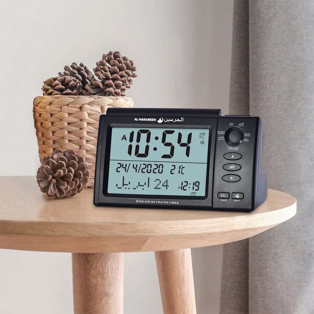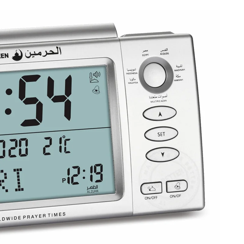* Полный азан для всех молитв Характеризуется AL-HARAMEEN часами с высоким качеством звука Azan для всех молитв с регулятором громкости azan, установленным на всех моделях часов. * Девять систем taqweem запрограммированы в часах AL-HARAMEEN использует местную taqweem или наиболее широко используемую систему taqweem для вашего города. Другие стандартные системы taqweem доступны следующим образом: *(DF) Local taqween Саудовская Аравия таквеем ум аль-Кура Страны Персидского залива и Аравийский полуостров Jordan и Palestine: Jordan taqween Египет и другие арабские страны: египетская taqween Северная Америка: ИСЛАМСКОЕ ОБЩЕСТВО Северной Америки (ISNA) Индийский субконтинент: Исламский университет Европа и другие страны Исламская Всемирная организация • H) Выбор метода Hanafi для ASR • F: 15 Umm al-Qura taqweem • F: 18 Umm al-Qura taqweem • F: 19 Umm al-Qura taqweem • 18,17 мусульманская мировая Лига (мусульманская лига) • 19:17 Египетский таквеем (Египет) • 18: 18 Исламский университет в Карачи (Hanafi taqweem) • 15:15 ИСЛАМСКОЕ ОБЩЕСТВО Северной Америки (ISNA) • 1:30 фиксированное время. Fajr время определяется как фиксированный интервал времени до времени shrooq. Время Isha определяется как фиксированный интервал времени после Magrib azan. Эта система используется в Северной Европе. * Автоматическая сигнализация Iqamah для всех молитв Эта уникальная функция напоминает вам каждый день точно в то же время относительно azan. Например, предположим, что вы настроили будильник на 5:15 AM и Fajr azan на 5:05 AM. На следующий день, если Fajr azan станет 5:06 AM, то автоматически этот будильник изменится на 5:16 AM. В этот чехол, вы будете просыпаться через 10 минут после Fajr цифровых часов на открытом воздухе на каждый день. Дата Фаджр азан Будильник к утренней молитве 1 мая 5:05 AM 5:15 AM 2 мая 5:06 AM 5:16 AM автоматически изменяется на 5:16 * Ежедневная Сигнализация: будильник для работы и школы Ежедневный будильник-это обычная сигнализация, которая звонит одновременно каждый день. Кроме того, этот будильник может быть установлен, чтобы не звонить в выходные дни. * Направление Qibla Направление Qibla (по отношению к северу) может быть отображено. Угол Qibla также будет отображаться между 0 и 360 градусов, по часовой стрелке с северной стороны. * Хиджри и григорианские календари Часы AL harameen могут отображаться как Hijr, так и григорианские календари каждые 10 секунд, или вы можете выбрать один из них, нажмите H-G при отображении. Календарь хиджри следует за григорианской датой и основан на астрономической Луне, видимой в Мекке. * Отображение температуры Отображение показаний температуры в градусах Цельсия (°C) и фахаратена (°F). * Полноэкранный El светильник * Вариант повтора * Внешний вход постоянного тока 6 Вольт 300 мА * Аудиовыход (подключение к динамику) * Возможность сохранения дневного света (для стран, использующих эту систему) * Напоминание о нежных молитвах (когда звук azan выключен) * Можно легко добавить новый город (долгота, долгота и GMT информация) * Можно легко изменить время отсчета молитвы на окраину городов * Звук Crescendo: все сигналы тревоги имеют слабый звук пробуждения, который постепенно увеличивается * Один будильник, в дополнение к Fajr и ежедневным будильникам, AL-HARAMEEN часы включают дополнительный будильник (называется будильником 1 день). Можно установить кольцо для специальных встреч. Упаковочный лист Часы Azan-1 шт. 1 x Руководство пользователя 1 x Кредитная карта 1 x Подарочная коробка