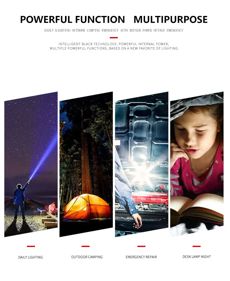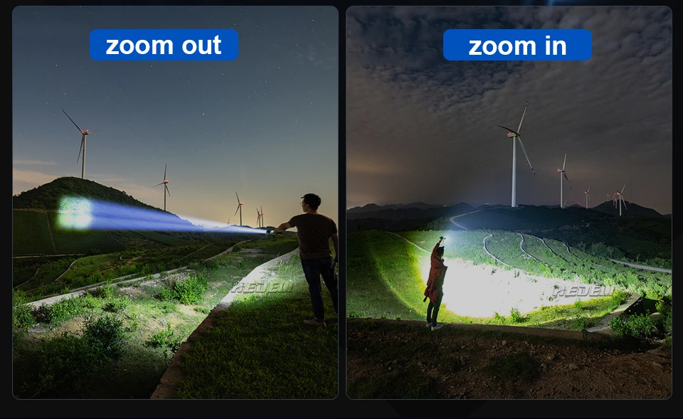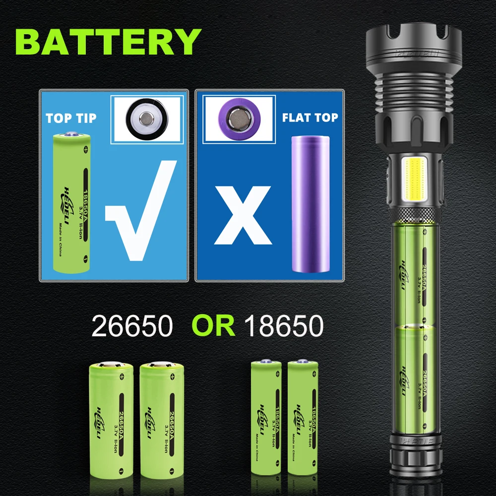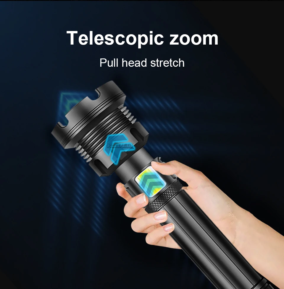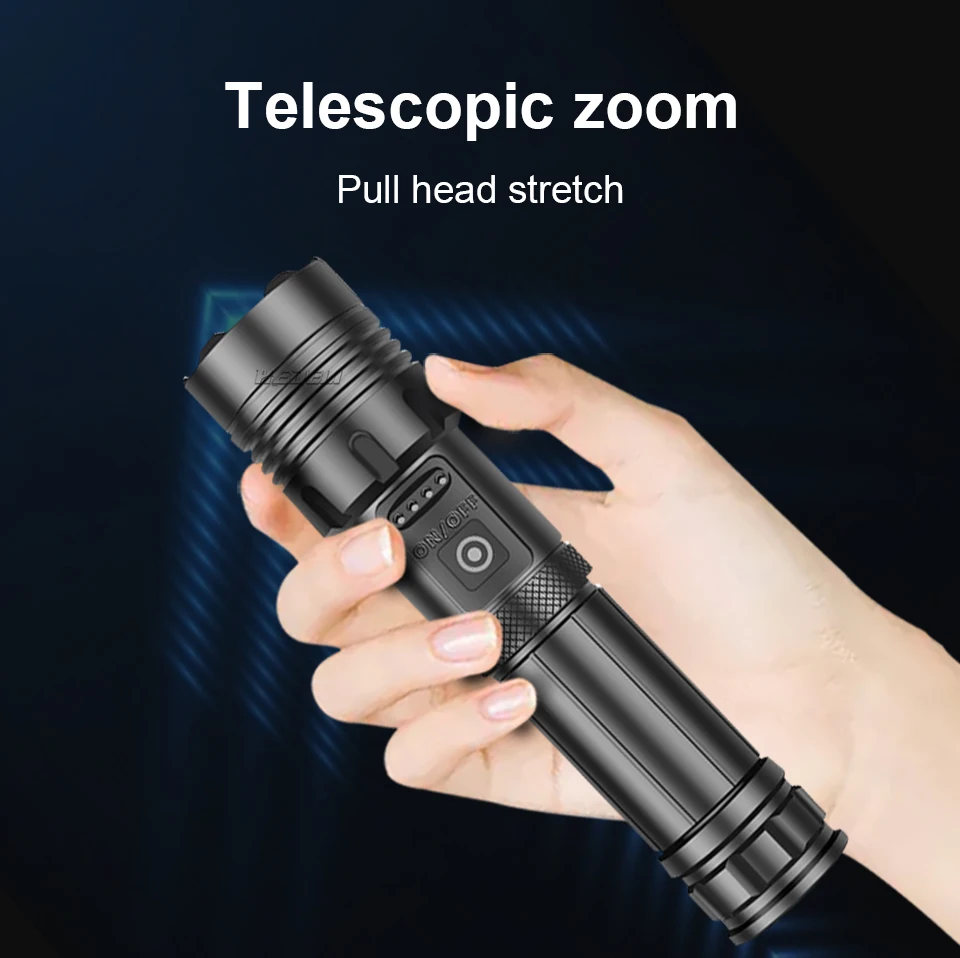 Сильный светильник-вспышка использует светодиодный светильник XHP50.2 с максимальной яркостью 250000 люменов и радиусом облучения 600 метровТелескопический зум; Яркий на больших расстояниях, более четко на близком расстоянии5 режимов: высокий, средний, низкий, вспышка, SOS (прост в использовании в различных сценариях)Используйте перезаряжаемый аккумулятор 1*18650 или 1*26650, время работы 26650 большеПортативный микро USB вход, подходит для автомобиля/мобильного питания/компьютера/USB разъем4 уровня отображения мощности (1% ~ 25%, 25 ~ 50%, 50% ~ 75%, 75% ~ 100%)Водонепроницаемый класс соответствует IPX-6, водонепроницаемость, может использоваться в дождливые дни, но не может быть помещен в водуИзготовлен из авиационного алюминиевого сплава, прочный HAIII военный Жесткий анодированныйПодходит для работы, охоты, альпинизма, рыбалки, кемпинга и активного отдыха и т. д.